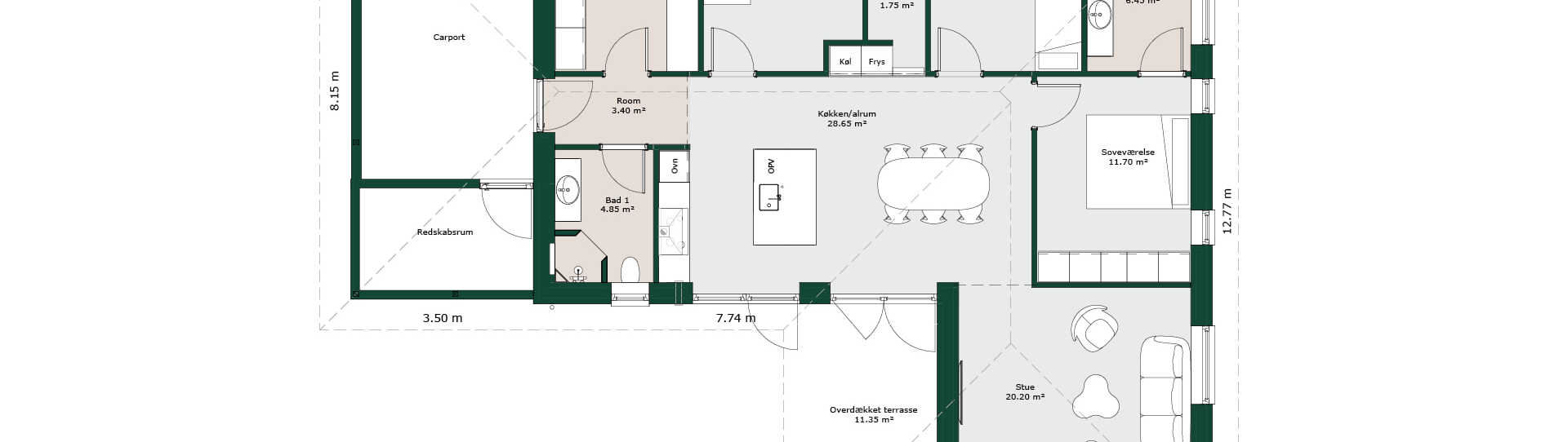 Denne indretning er den helt rigtige til den socialt anlagte familie. Fokus ligger på de store fællesrum på langs med huset – mod haven. Her er indrettet et rummeligt multirum med udgang til haven, der fx kan fungere som hele familiens arbejdsværelse. Herfra er adgang til stort køkken/alrum med flere havedøre og masser af lys. Fra køkken/alrum er der åben adgang til stuen, hvor en halvmur sørger for en flot visuel adskillelse af de to rum.