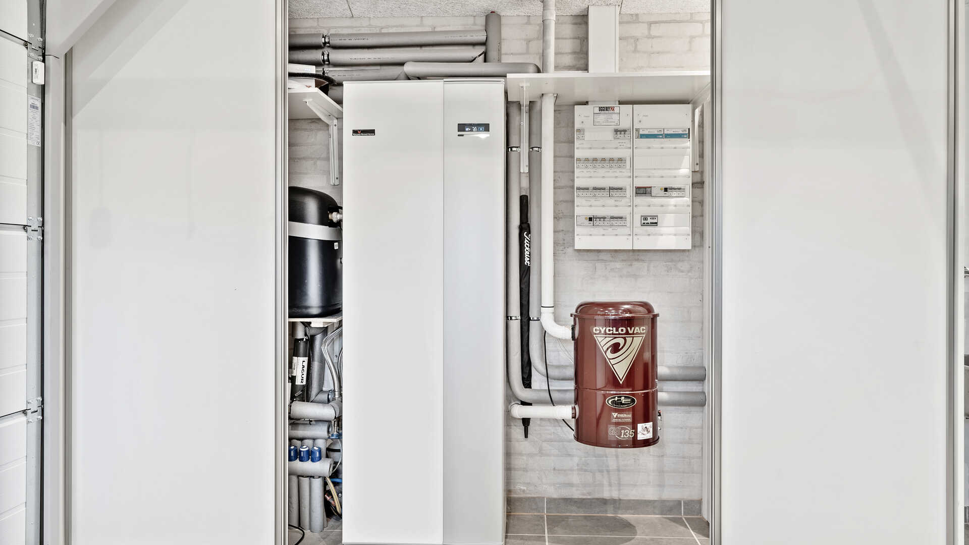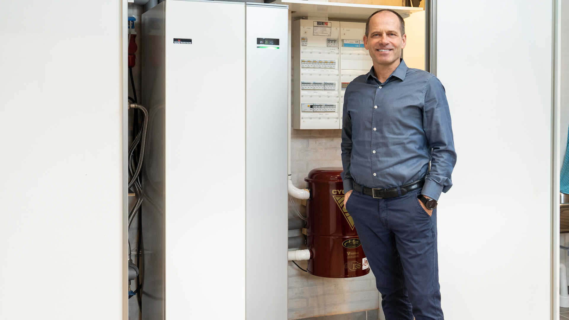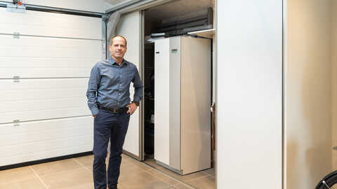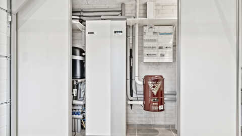 I kombination med solceller har Ulrich og Bente fået installeret en luft til vand-varmepumpe, der sørger for varme og varmt vand i huset.