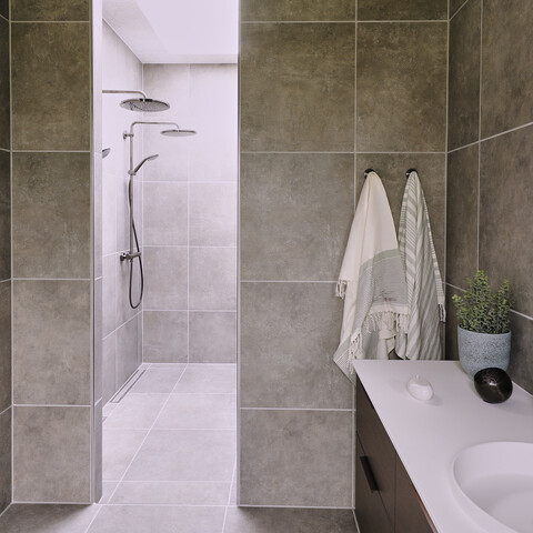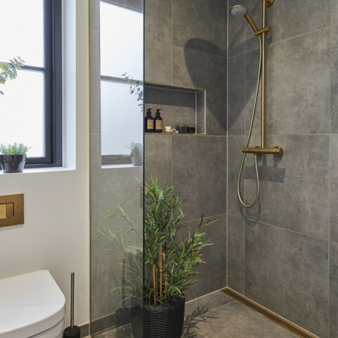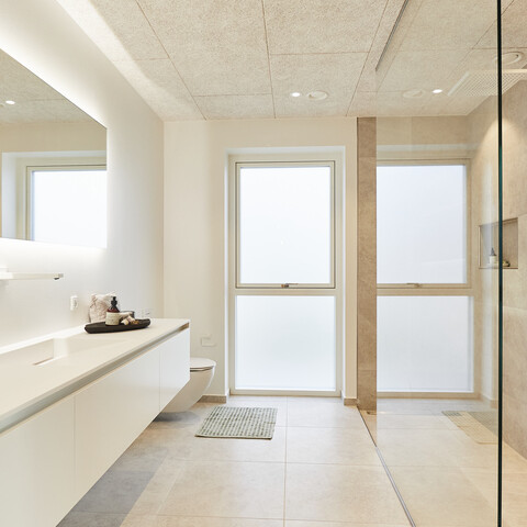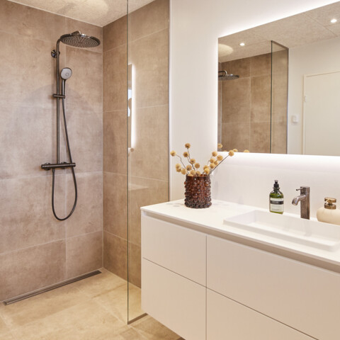 Åbne planløsninger og fællesrum fylder mere og mere i arkitekturen og er ofte efterspurgt i HusCompagniets hustyper. Det ligger i tiden, at vi gerne vil bruge tid sammen med dem, vi holder af – og den tendens er også flyttet ind på badeværelset, hvor vi gerne dedikerer mere plads og mere tid til husets store velværerum med gode materialer, grønne planter og den ultimative luksus; den dobbelte bruseniche.