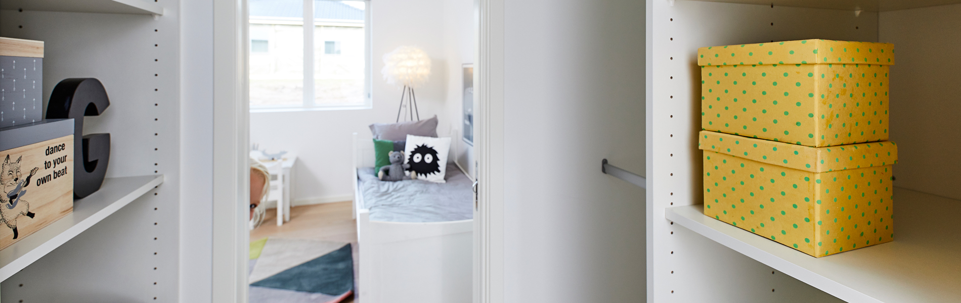Sko, gummistøvler og fodboldstøvler, vintertøj, sportstøj og sommertøj - alt skal finde sin plads i hjemmet. For mange bliver løsningen en kasse på loftet – med fare for manglende overblik og at tøj og ting bliver gemt og glemt. Med et walk-in mellem børneværelserne kan du organisere børnenes tøj og legetøj, så de og du nemt kan komme til de ting I har brug for, og børnene får mere plads til leg på værelserne.