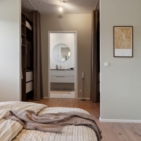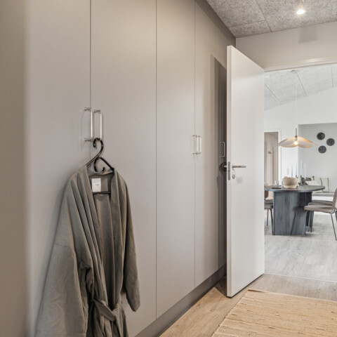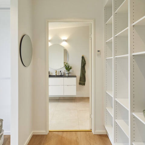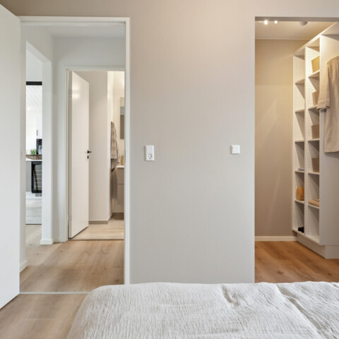 Hos HusCompagniet har du mulighed for at indrette lige præcis det hjem, du drømmer om og som passer til dit familieliv. Mange vælger at fordele værelserne, så børne- og voksenafdelingerne er adskilt. Udfordringen kan være, at der let kan komme til at herske uorden og kaos i de unges afdeling – men med et integreret walk-in mellem børneværelserne, kan I komme rodet i forkøbet.