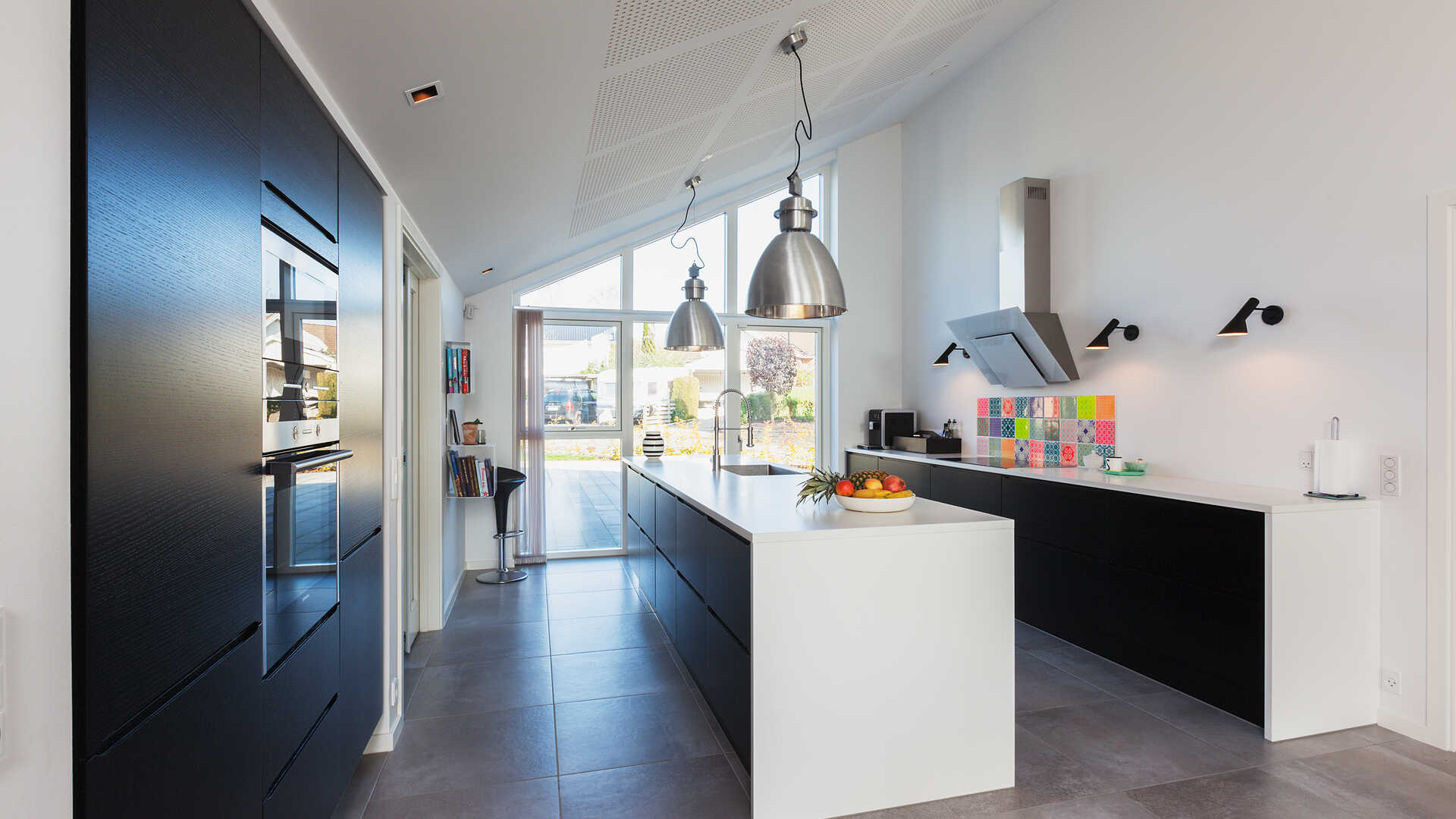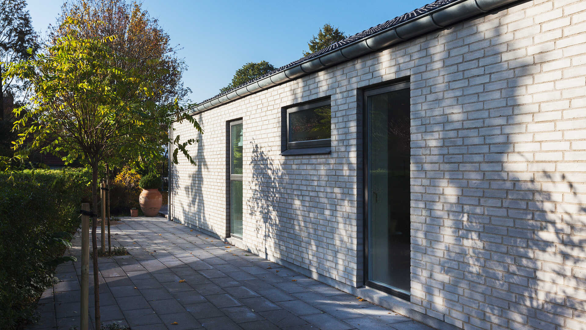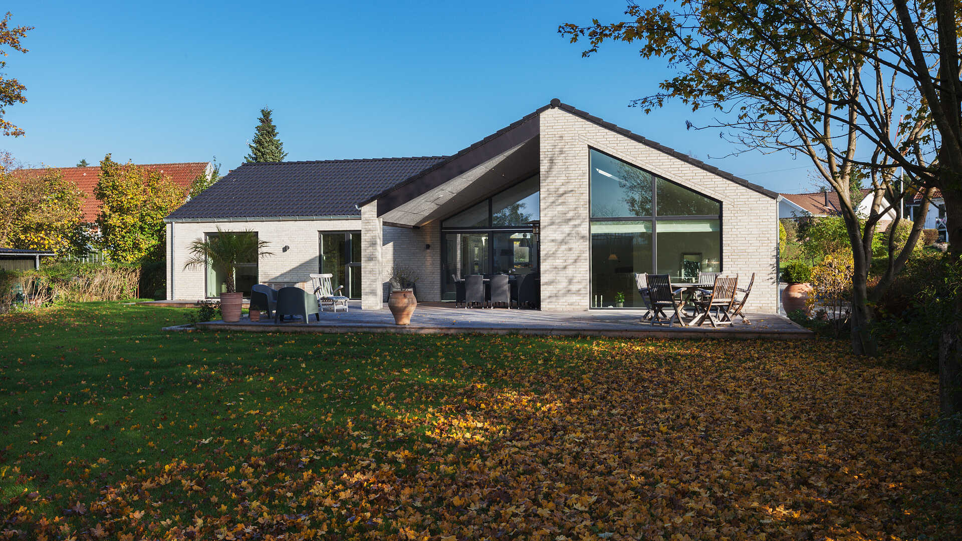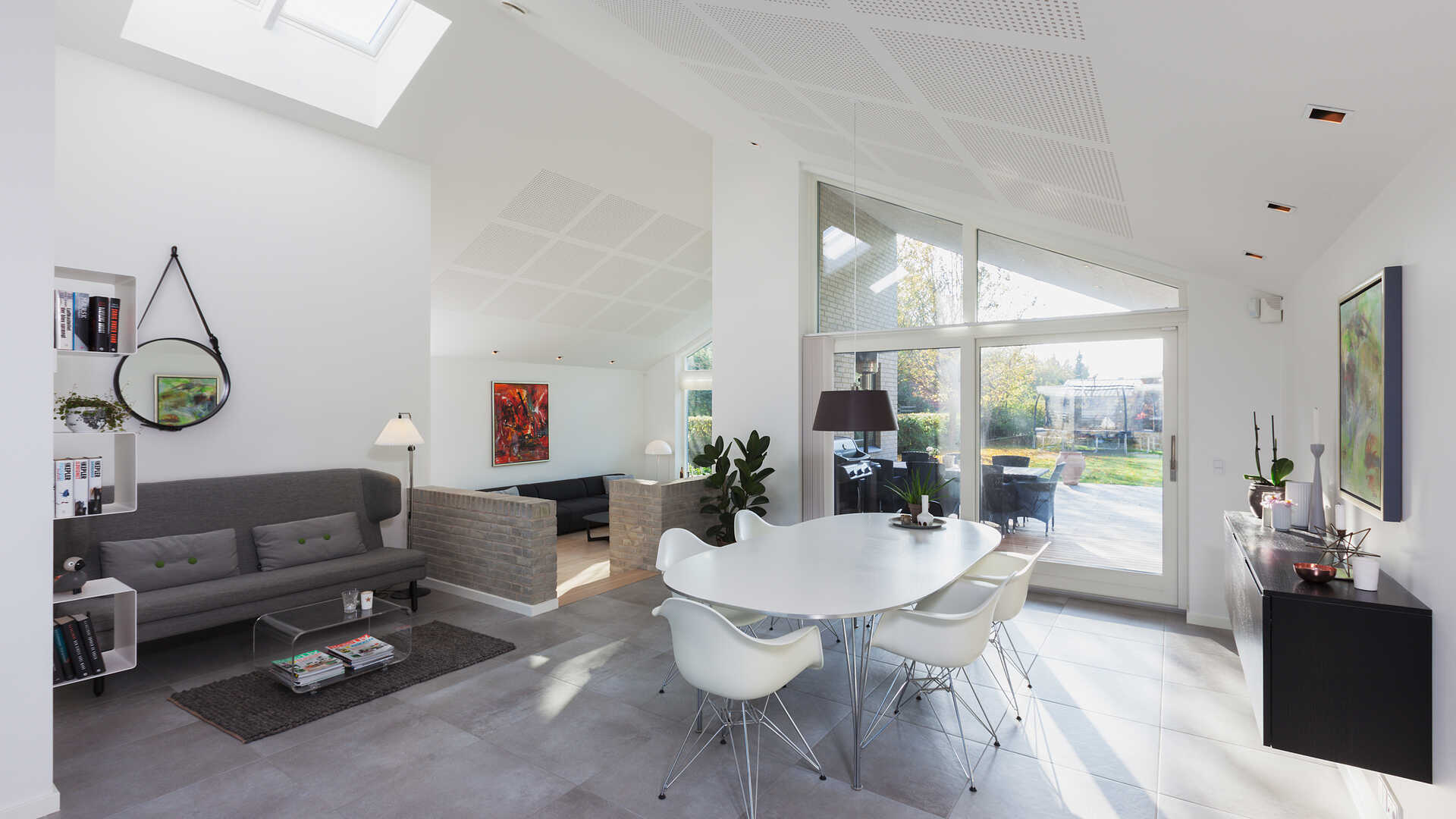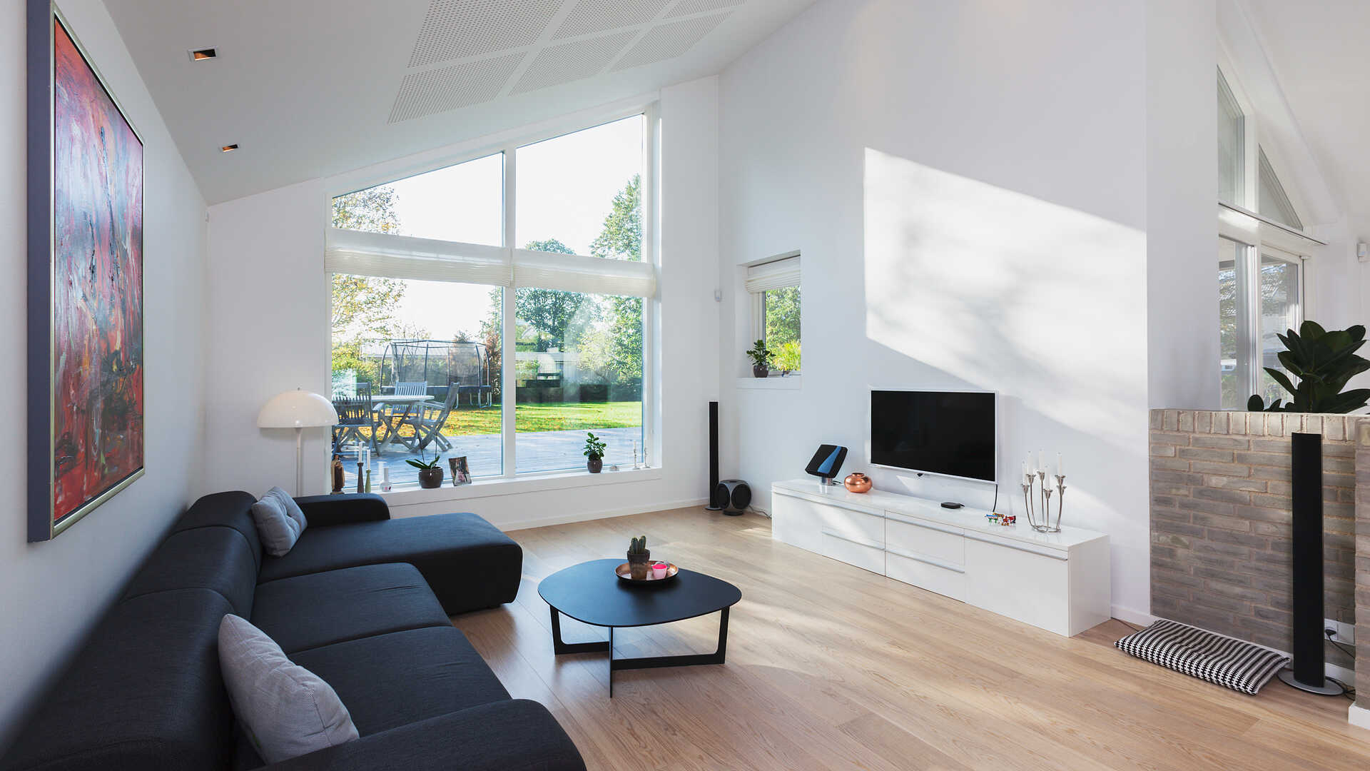Vinkelhus med masser af lysindfald og højt til loftet.