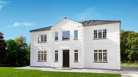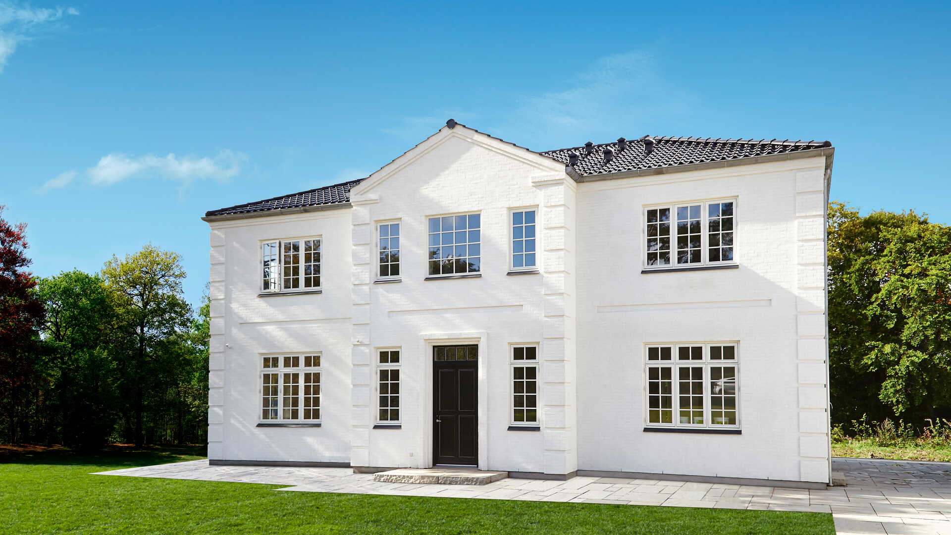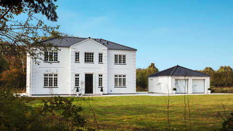 • Klassisk patricier-arkitektur med stor frontspids, valmtag og tegltag