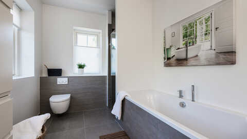 • Stor forældreafdeling på første sal indeholder soveværelse, badeværelse og walk in closet.