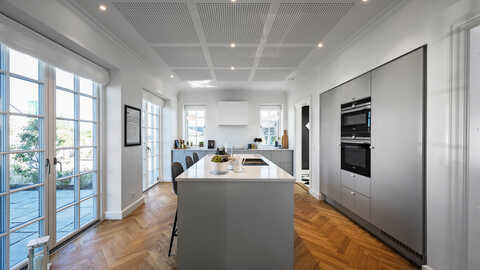 • Stort køkken med eget vin-/viktualierum og flot spisestue indrettet i husets frontspids med udsigt over haven.