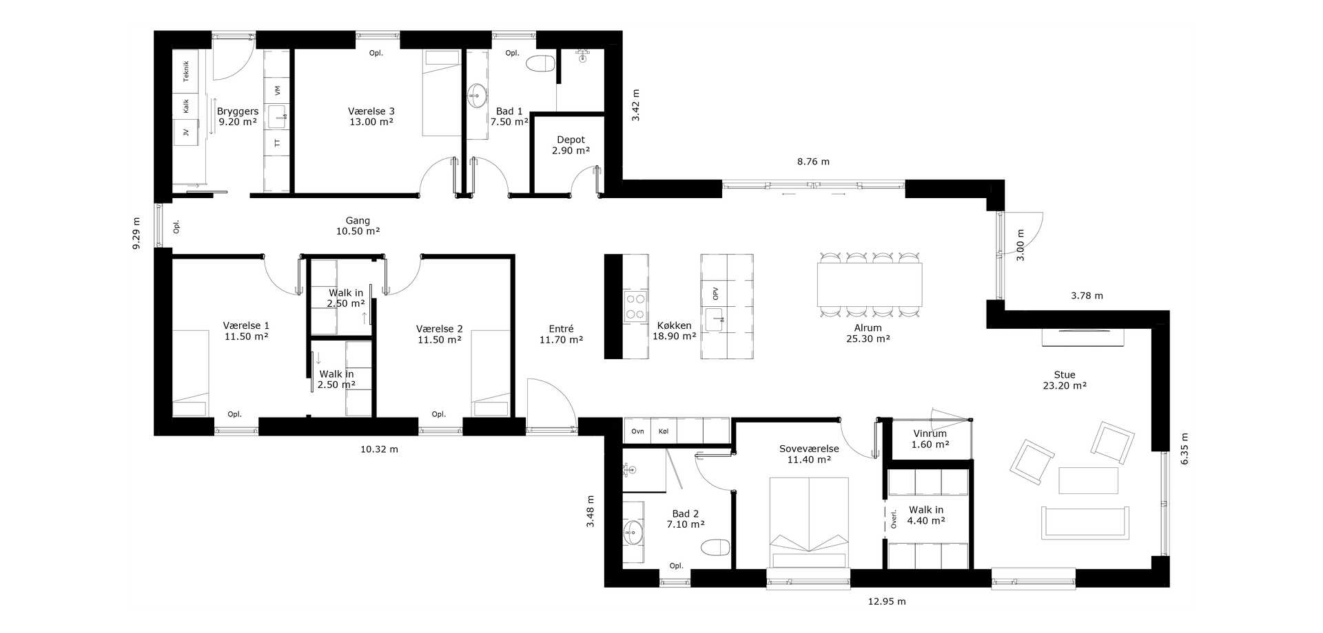 Køkken/alrummet ligger langs med husets længderetning, og med stor dobbelt skydedør, kipvinduer i gavlen og ovenlys fremstår det lyst og venligt på alle årets dage. Her er plads til gæster og det lækre vinrum med rå mursten og glasparti giver rummet personlighed.