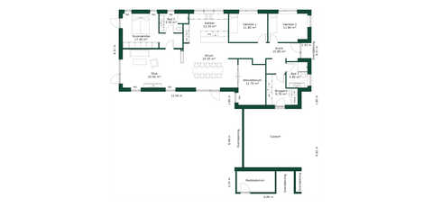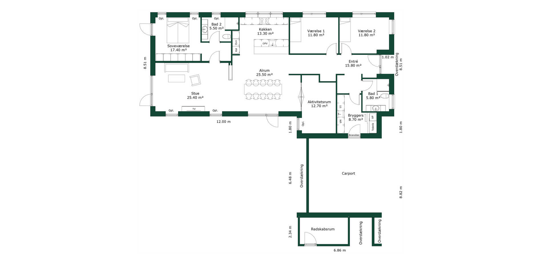 Køkken/alrum ligger på tværs af huset og giver et fantastisk lysindfald fra 2 sider. I køkkenet er lavet tre smalle vinduer som muliggør indbygning af emhætte i niche.
