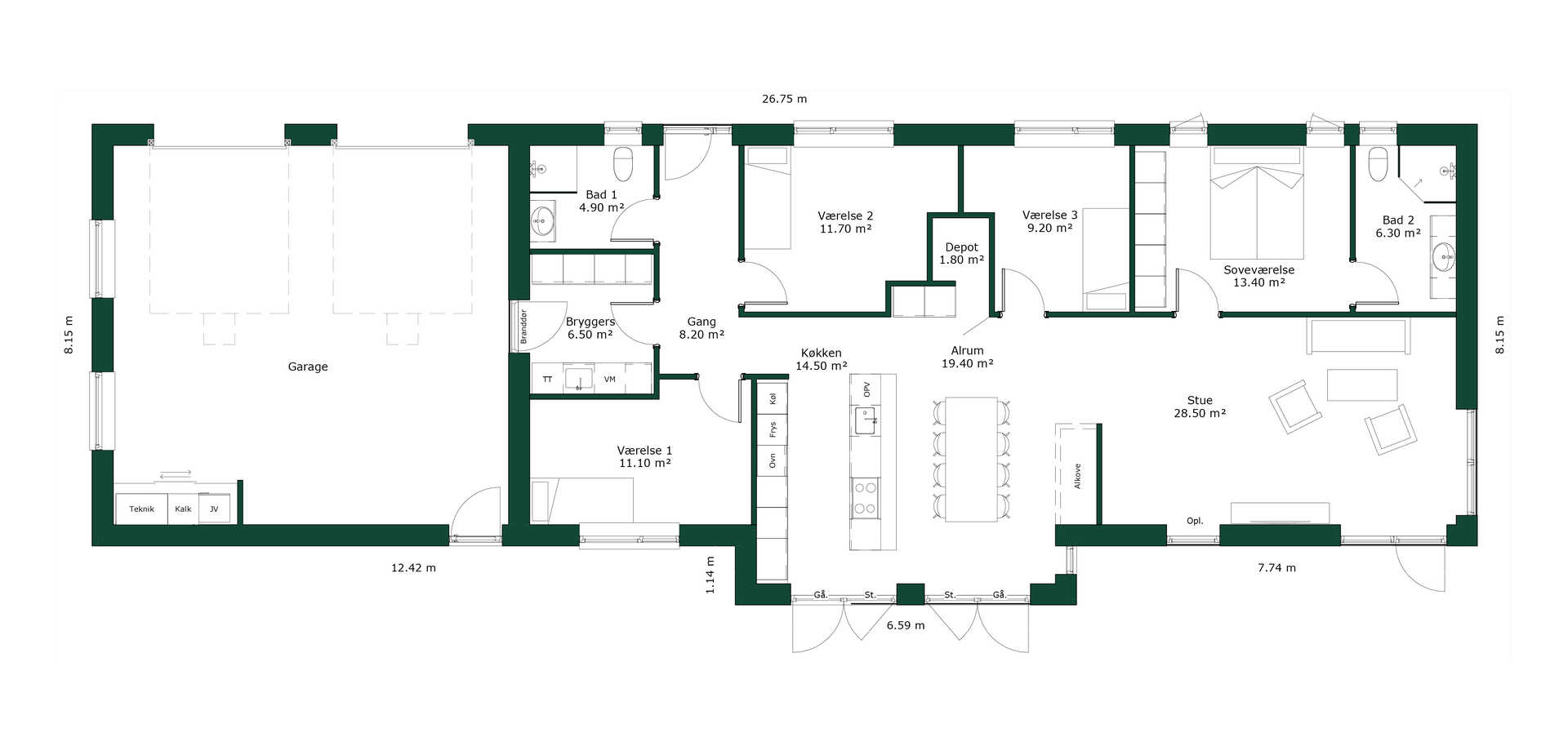 Når man træder indenfor i husets entré, bliver man mødt af et smukt lysindfald fra det dobbelte ovenlysvindue. Entre/gang er samtidig fordelingsgang til 2 dejlige børneværelser samt bryggers og badeværelse. Entré/gang går direkte ind til husets store lyse køkken/alrum. Køkken/alrum ligger i åben forbindelse med stuen – alene adskilt af en alkove som giver mulighed for hygge centralt i huset. Endvidere er der i alrummet depot og indbygget skabe.