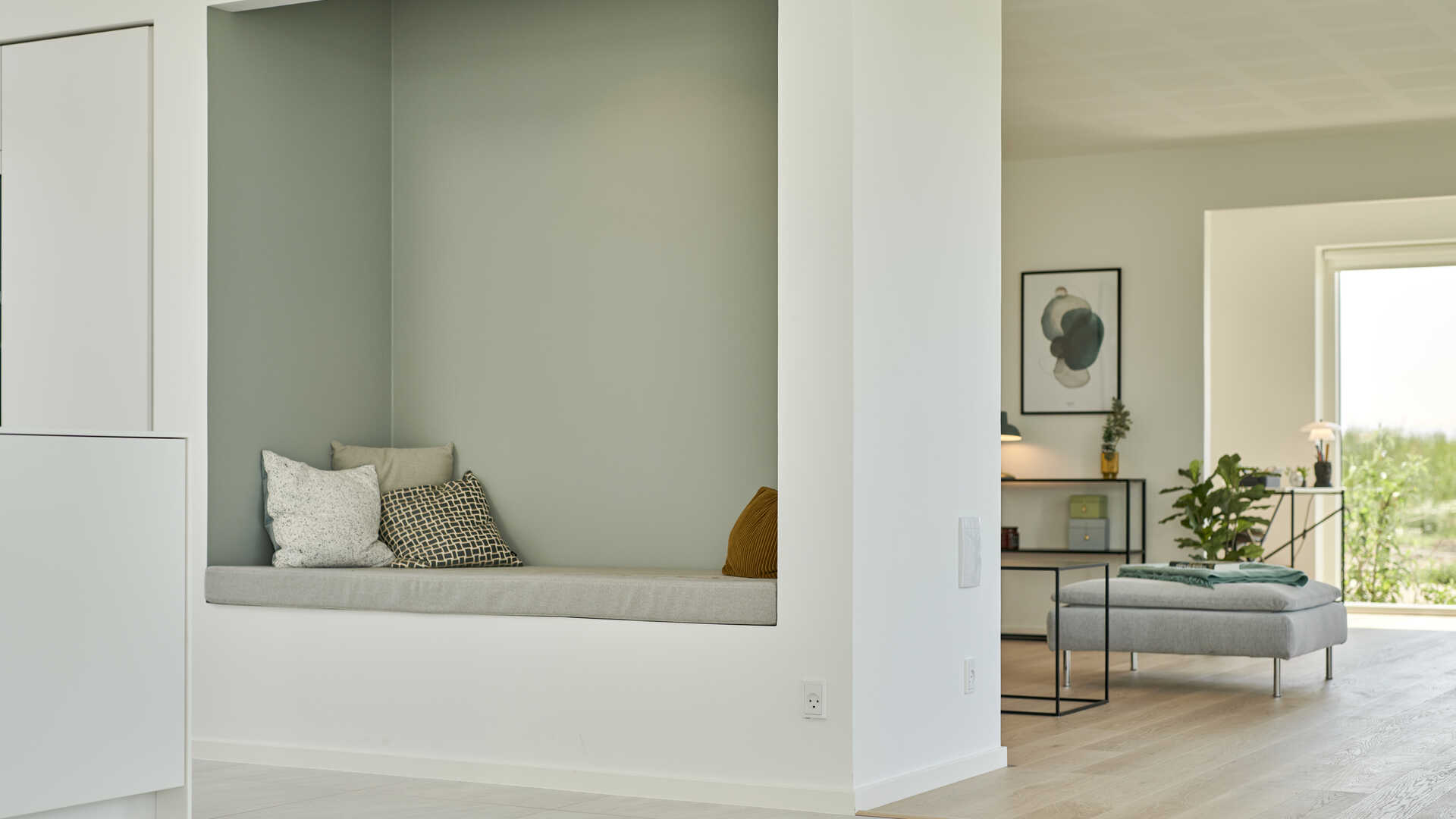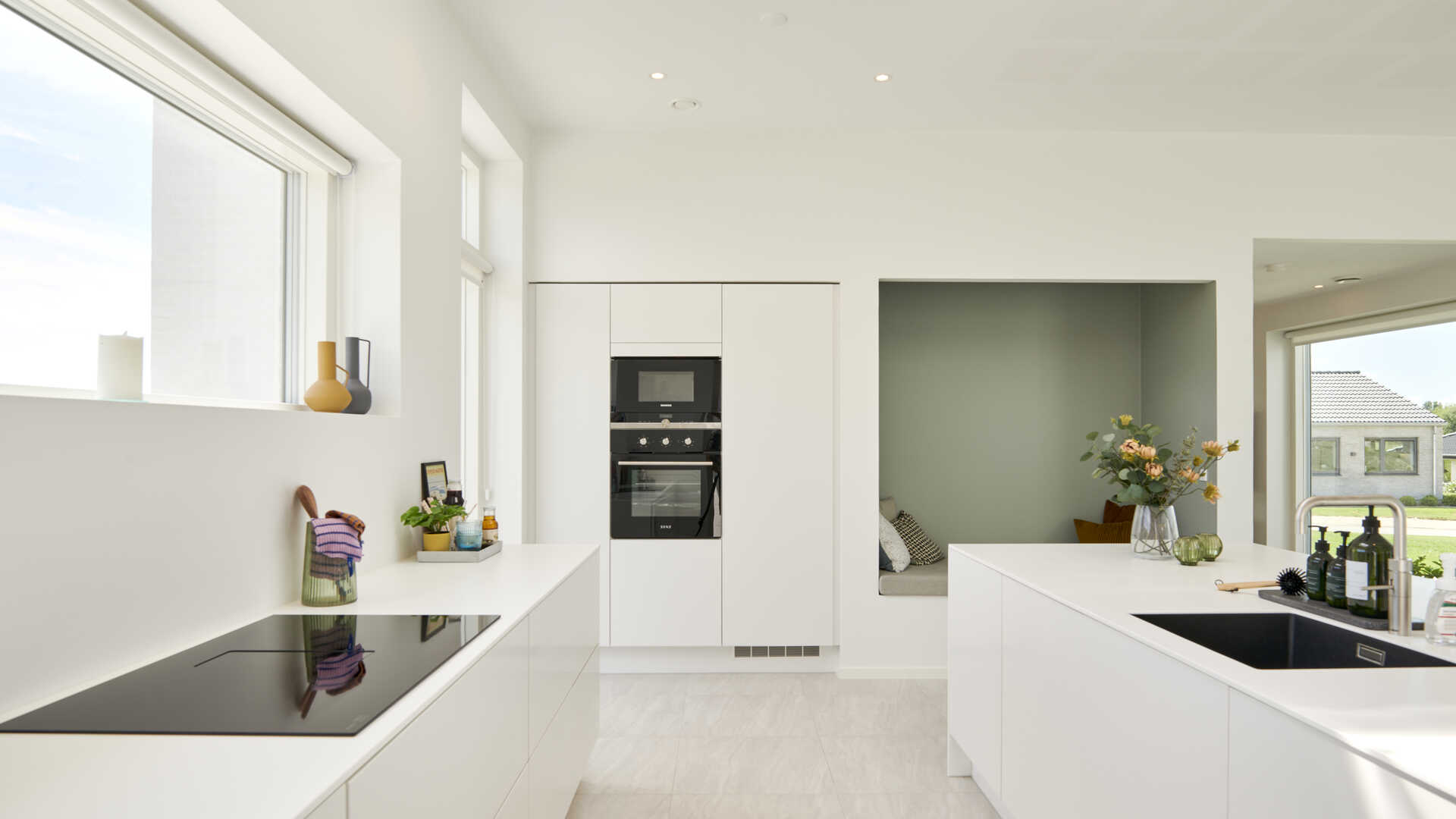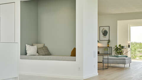 detaljer. Køkken/alrummet er desuden indrettet med en alkove som inviterer til masser af hyggestunder. Hver sin ende af huset er indrettet til henholdsvis børn og voksne.