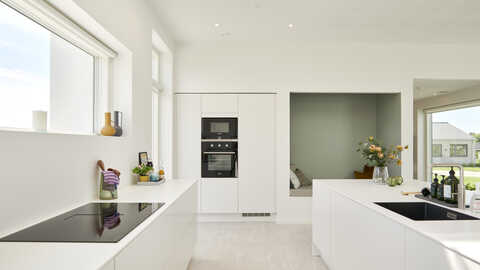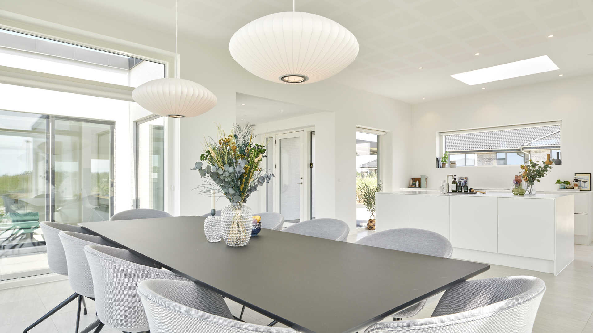 Går man i stedet til venstre, ankommer man i det imponerende køkken/alrum. Her er ekstra højt til loftet og lyst indrettet med stort vinduesparti, ovenlys, HTH køkkenelementer og eksklusive