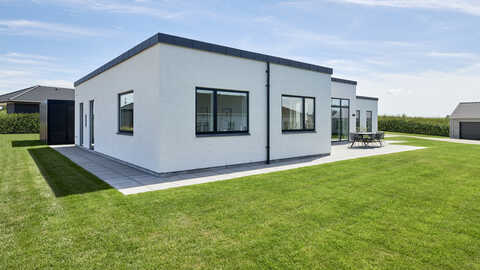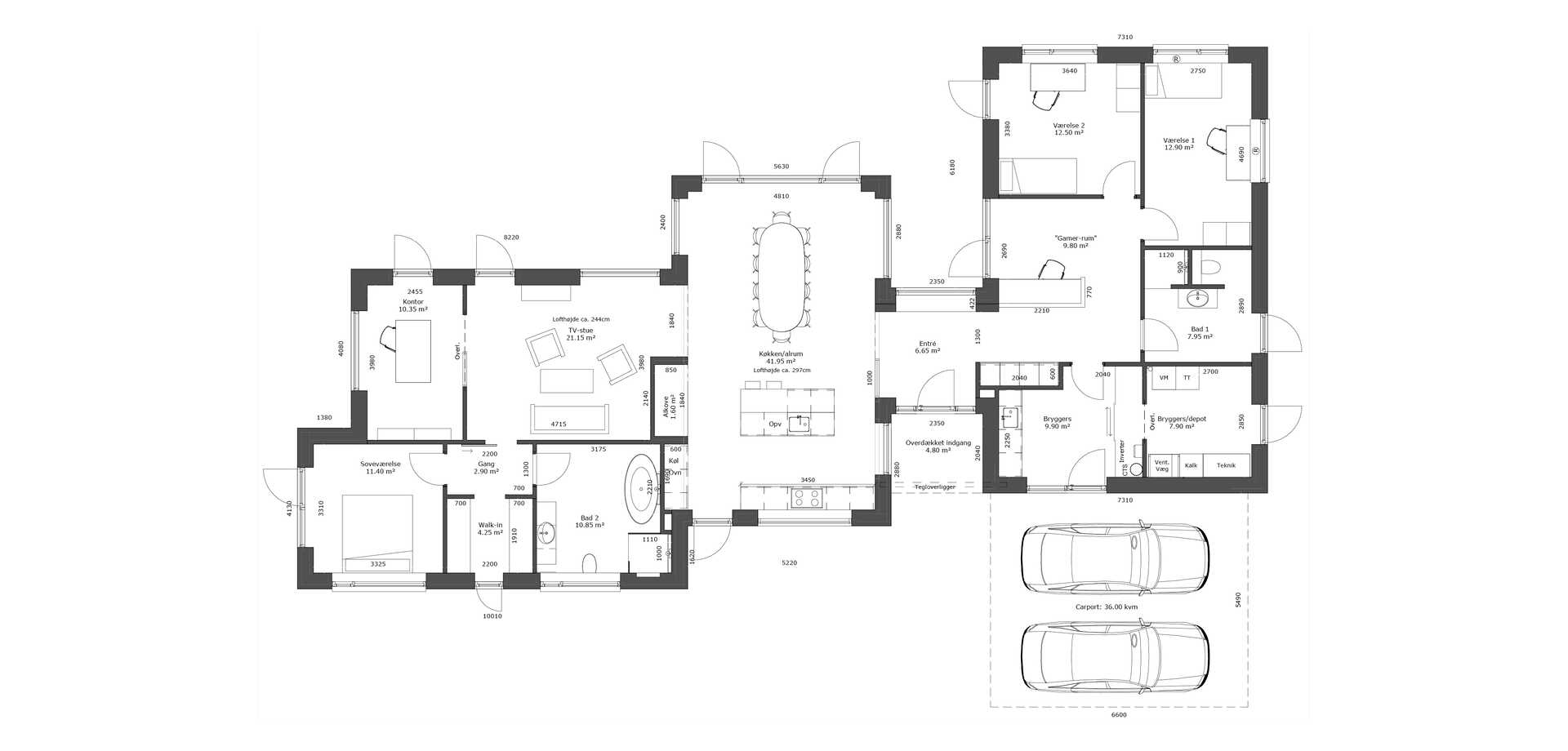 Den 216 m2 store villa er indrettet med en åben entré, hvorfra der er adgang til børneafdelingen og et stort bryggers og depot/garderobe.