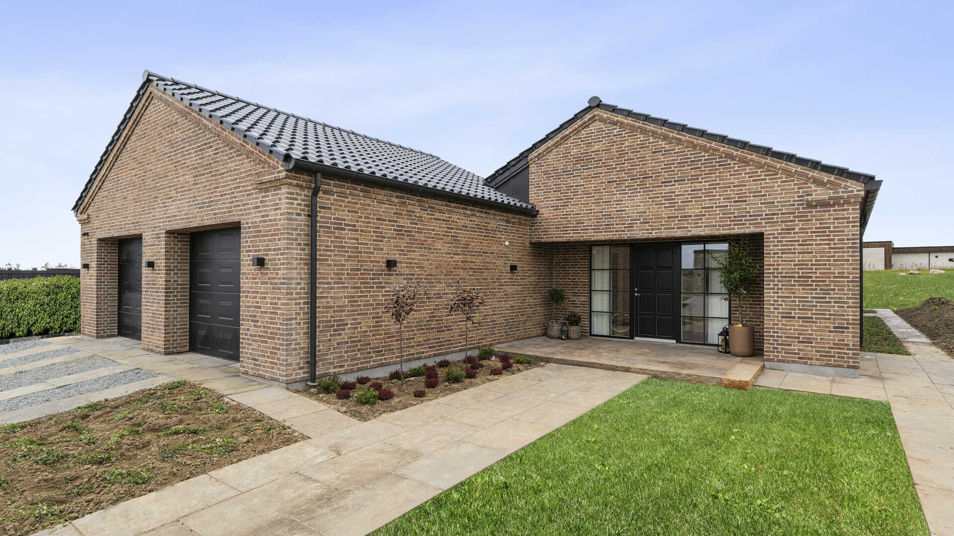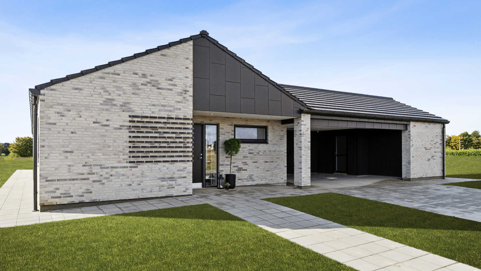 Garagen fuldender helheden med teknikskab, dobbelte porte og vinduer i stil med husets øvrige arkitektur og detaljer. Og hvor de brunrøde mursten leder tankerne hen på dansk byggetradition, skaber de sorte tagrender, zinkbeklædning og vinduesrammer en elegant kontrast.