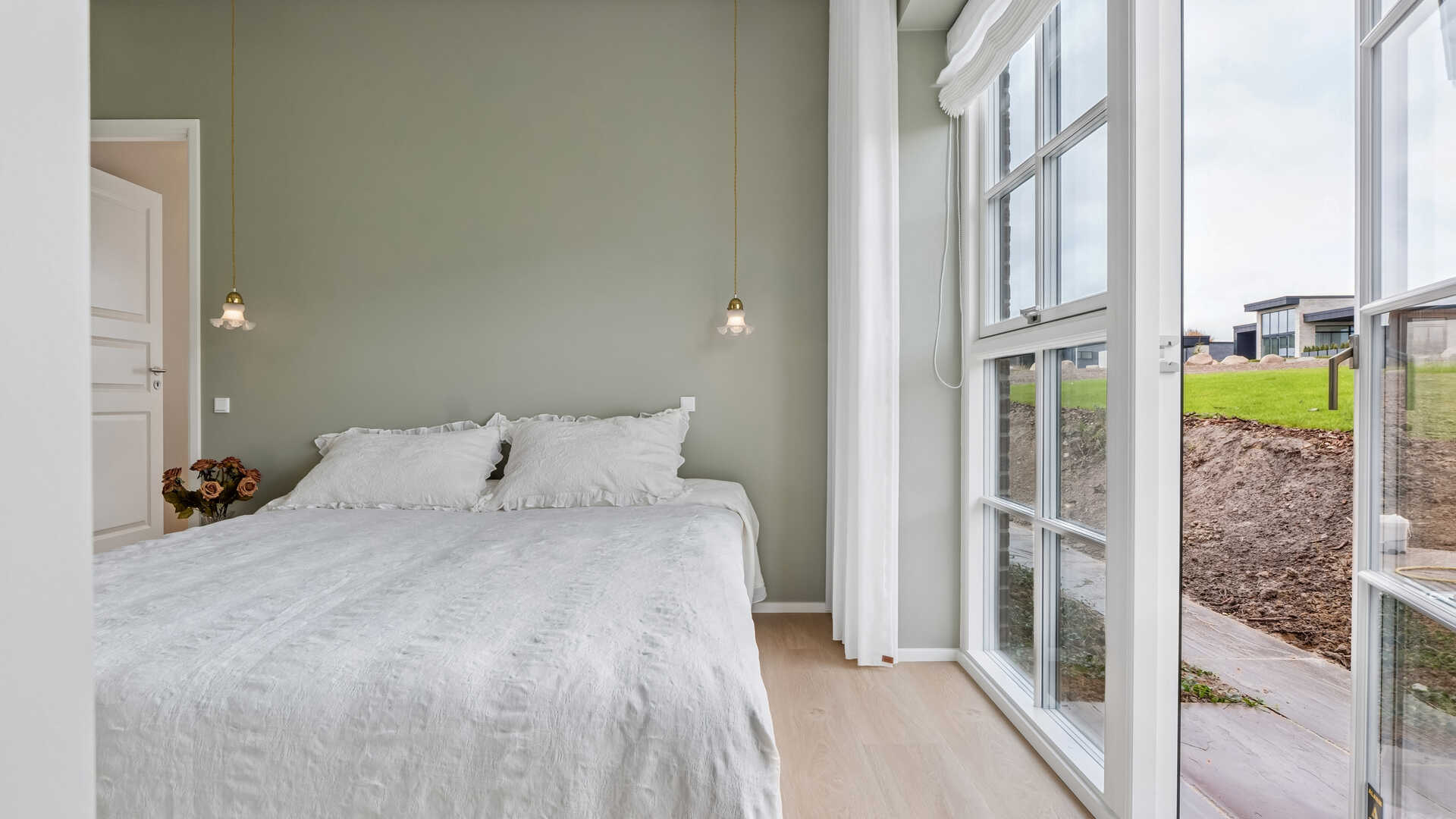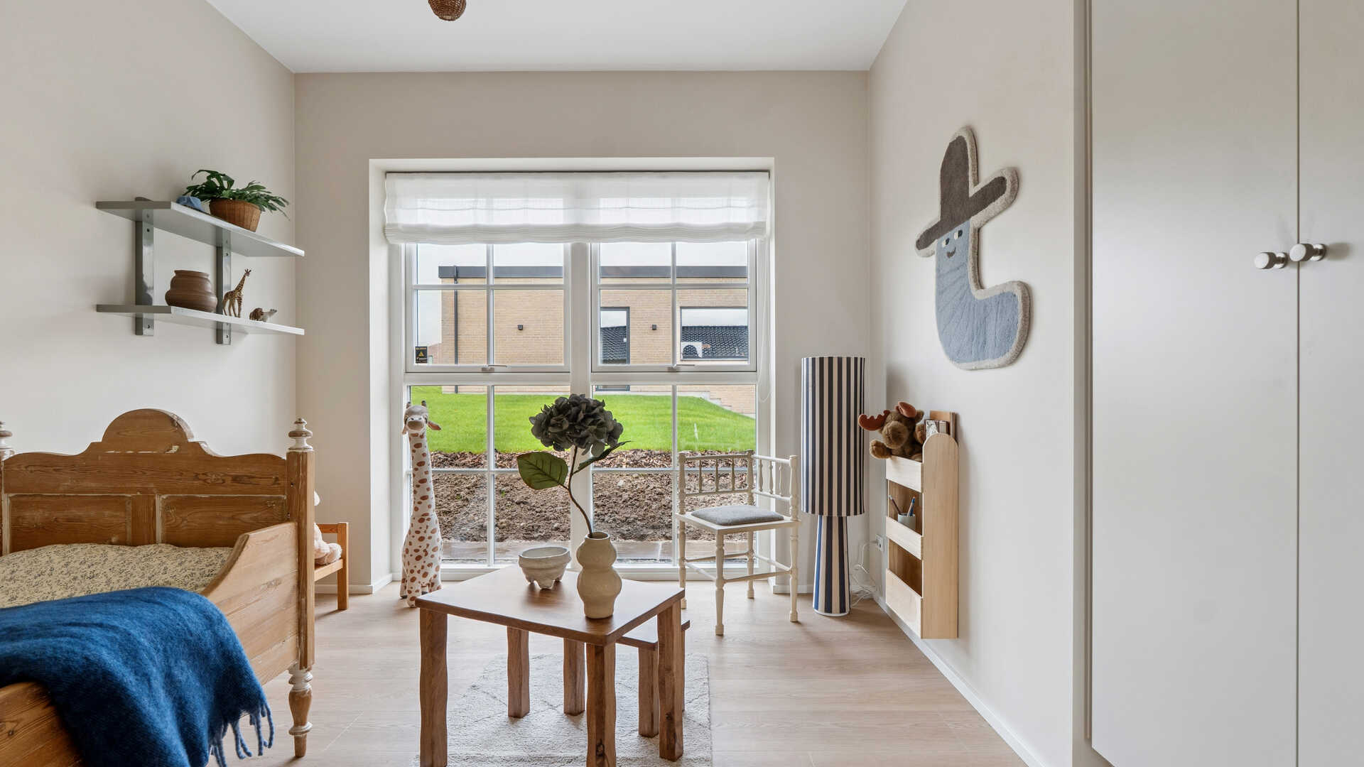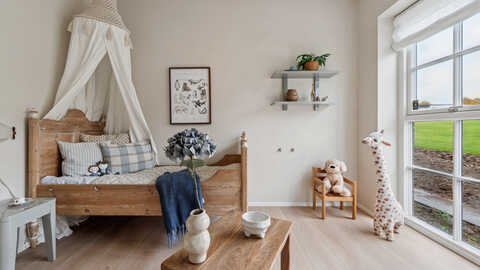 Fra køkken-alrummet er der ligeledes direkte udgang til en terrasse, hvor en smuk læmur skaber et privat uderum. Husets hyggelige stue ligger i forlængelse af alrummet og fungerer som bindeled til voksenafdelingen med soveværelse, walk-in-closet og et dejligt badeværelse.
