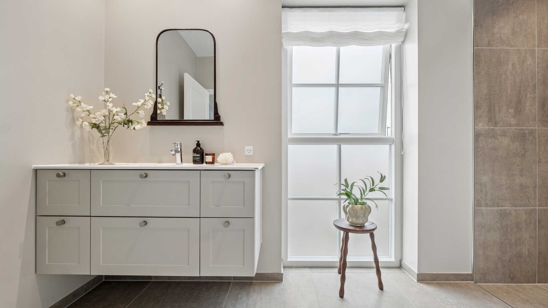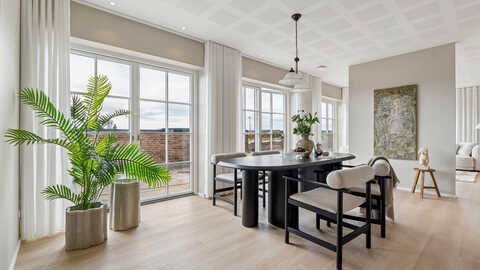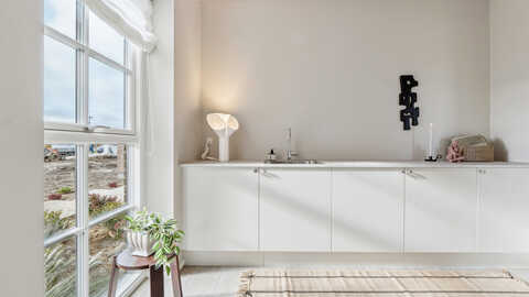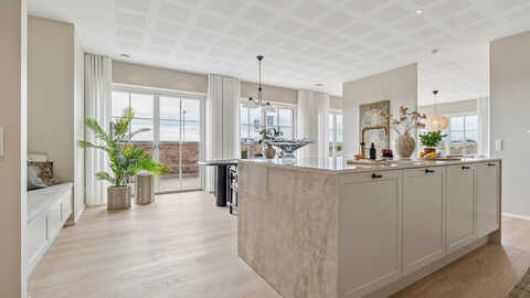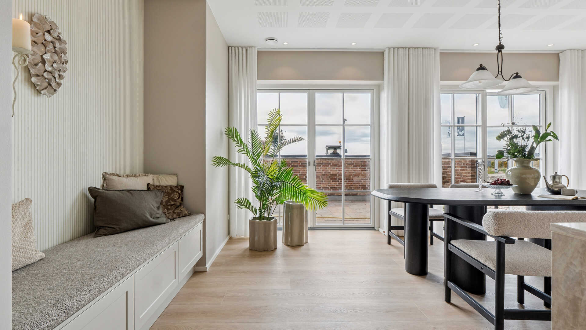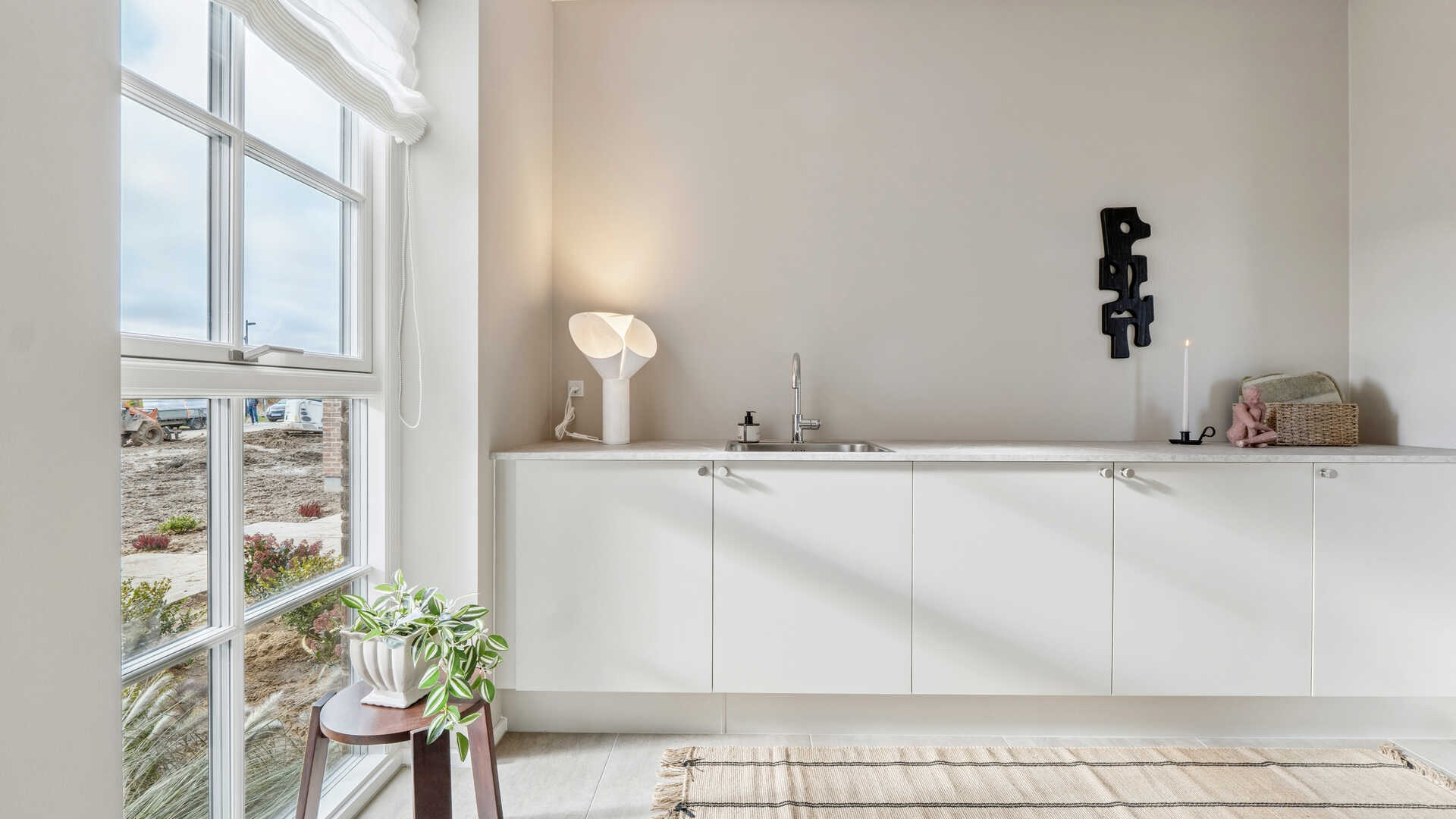 For enden ad gangen åbner det store køkken-alrum sig, hvor ovenlys og store terrassedøre lukker dagslyset ind og skaber en luftig atmosfære i rummet. Køkkenøen har en central placering i rummet, som giver rig mulighed for at kombinere madlavning og samvær. Derudover har køkkenet rigelig skabsplads og adgang til et praktisk depot, som gør det nemt at organisere og holde overblik – også når hverdagen suser afsted.