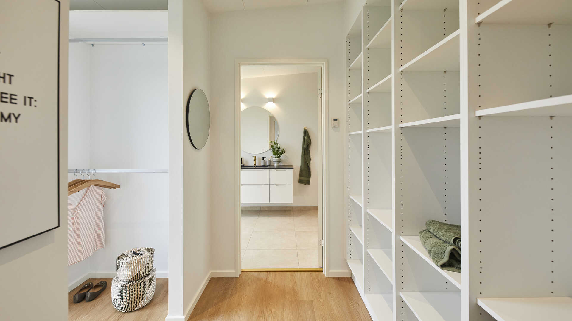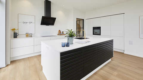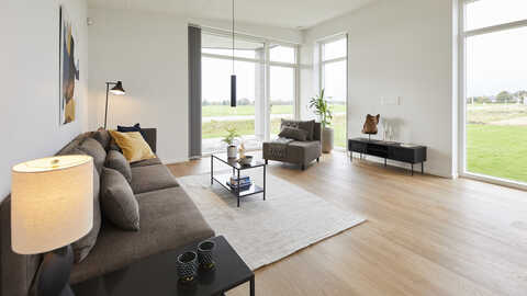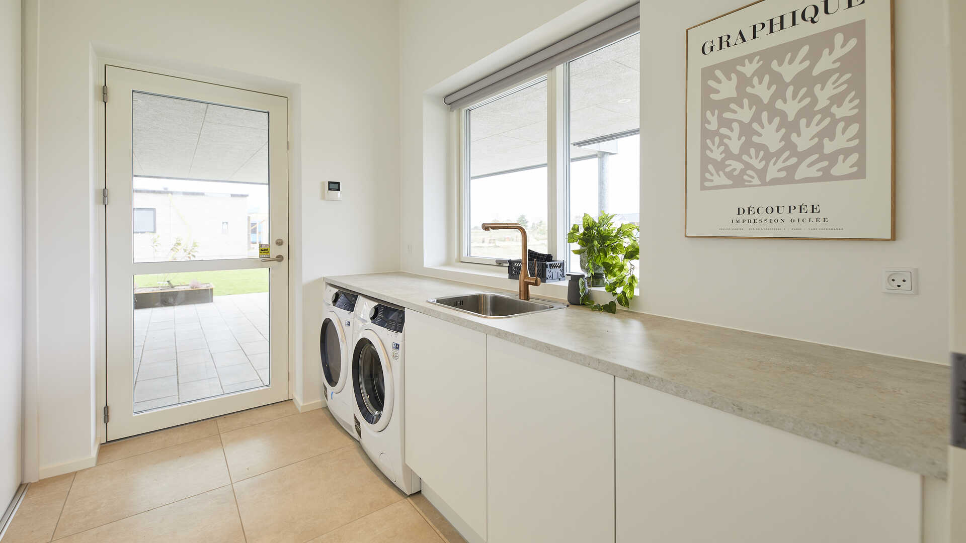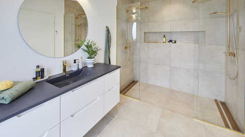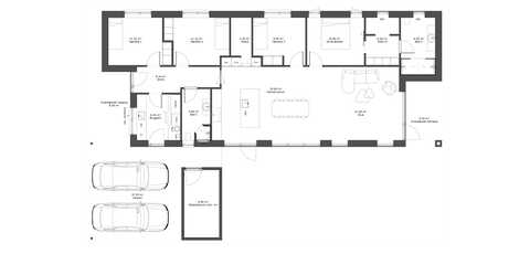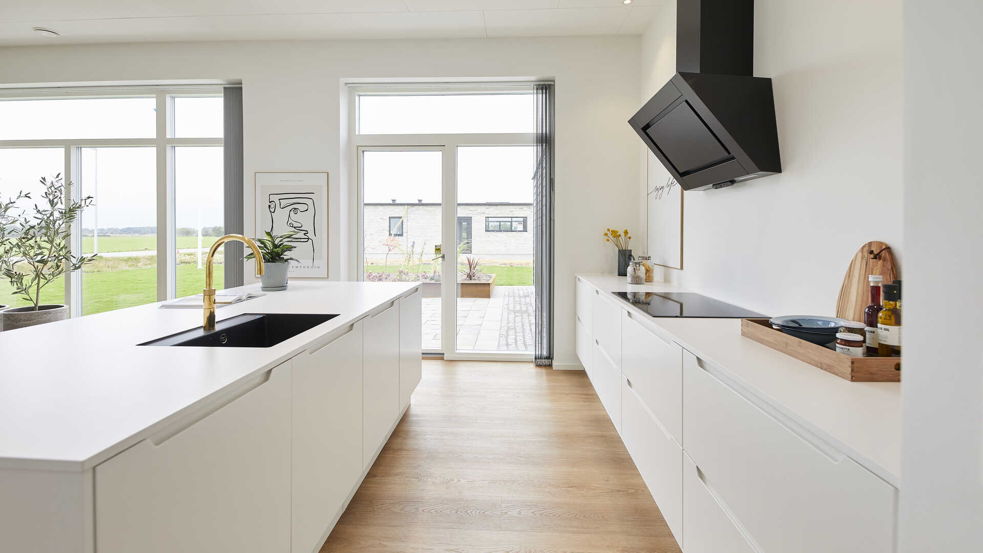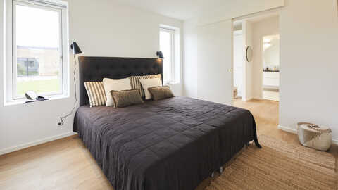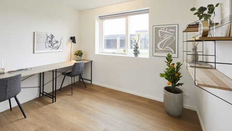 I den anden ende finder man husets soveværelsesafdeling der indeholder soveværelse med walk-in og badeværelse med dobbeltbrus. I husets midte finder vi køkken/alrum med stort ovenlysvindue og åben adgang til stor stue med udgang til overdækket terrasse.