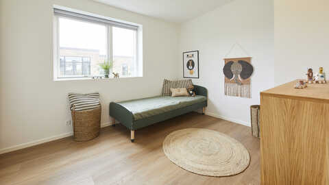 Huset er indrettet med en børneafdeling i den ene ende af huset, som indeholder 2 store børneværelser, et badeværelse og bryggers.