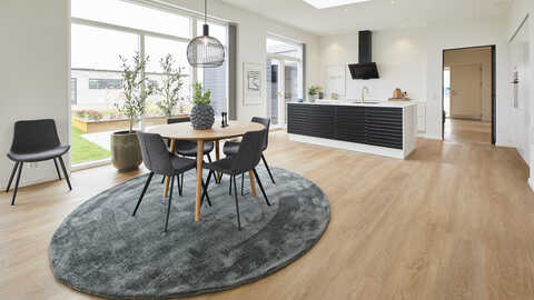 Huset byder på mange spændende detaljer og et helt unikt lysindfald gennem de store vinduespartier i køkken/alrummet og yderligere dobbelte vinduespartier i stuen med ovenpåliggende vinduer.
