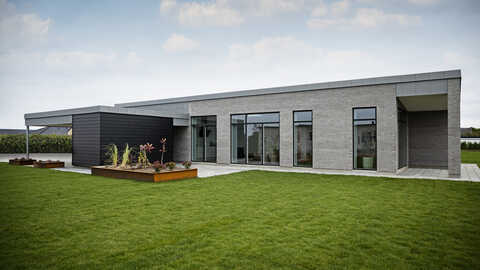 Huset er bygget i moderne funkisarkitektur med ensidig taghældning og tagpap på taget.