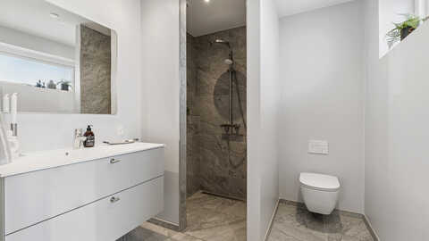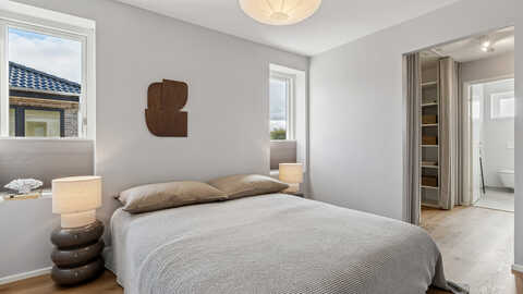 Husets voksenafdeling rummer et godt soveværelse, stort walk-in og badeværelse. Med to fine børneværelser med indbygget opbevaring, er huset perfekt for børnefamilien.