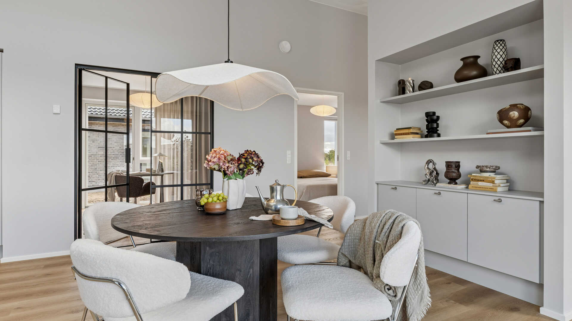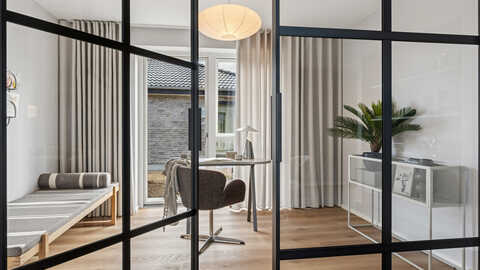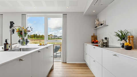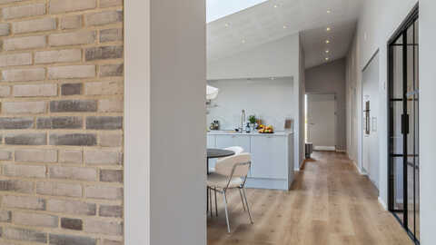 Her mødes man af et overdækket indgangsparti, der åbner op til husets entré og et fint langt kig gennem hele huset. Det store køkken-alrum ligger badet i dagslys fra både ovenlysvinduer og vinduespartierne og som husets hjerte ligger det som det helt naturlige samlingspunkt. Der delvist åbent mod stuen og med newyorker parti til kontoret, er der rig mulighed for at være tæt på hinanden selvom man ikke er i samme rum.