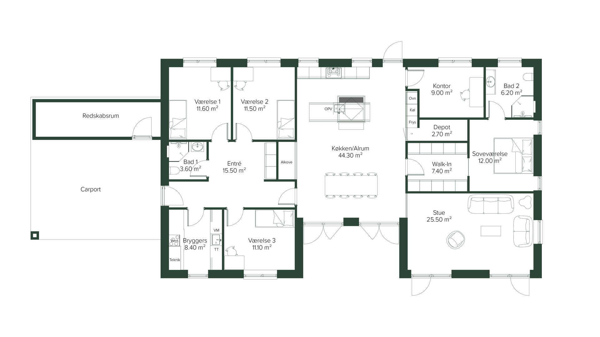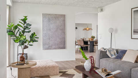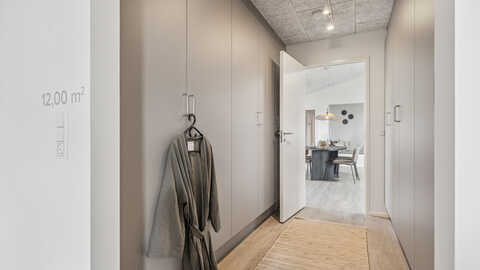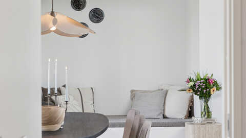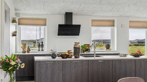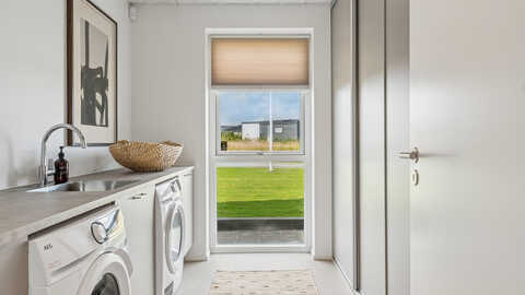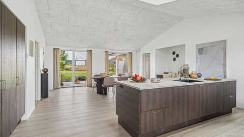 Husets naturlige samlingspunkt er det store, gennemgående køkken-alrum, der danner rammen om hyggelige hverdage og sociale stunder. Her er masser af lys og luft, og rummet indbyder til både fælles madlavning og samvær.