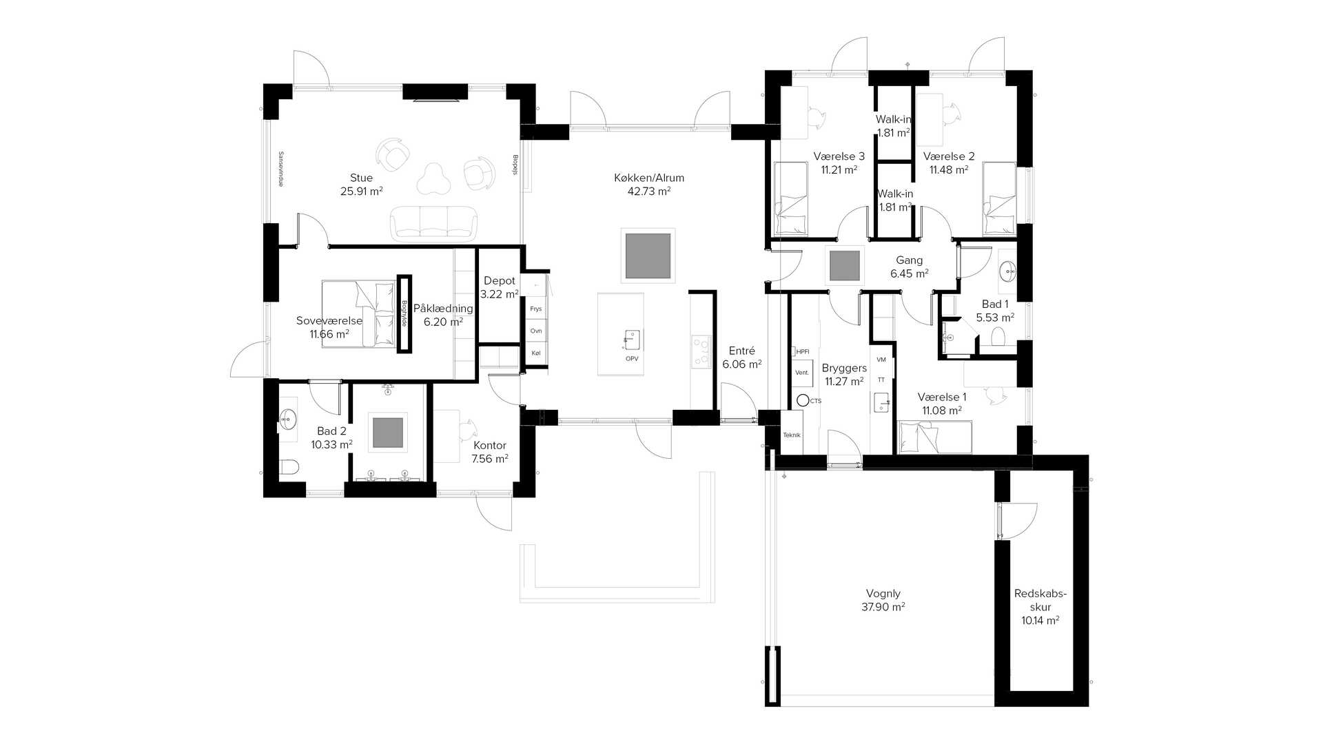 Flot og indbydende funkisvilla med lækre detaljer. Her får du en eksklusiv funkisløsning på 205 m2 og stor dobbelt carport.