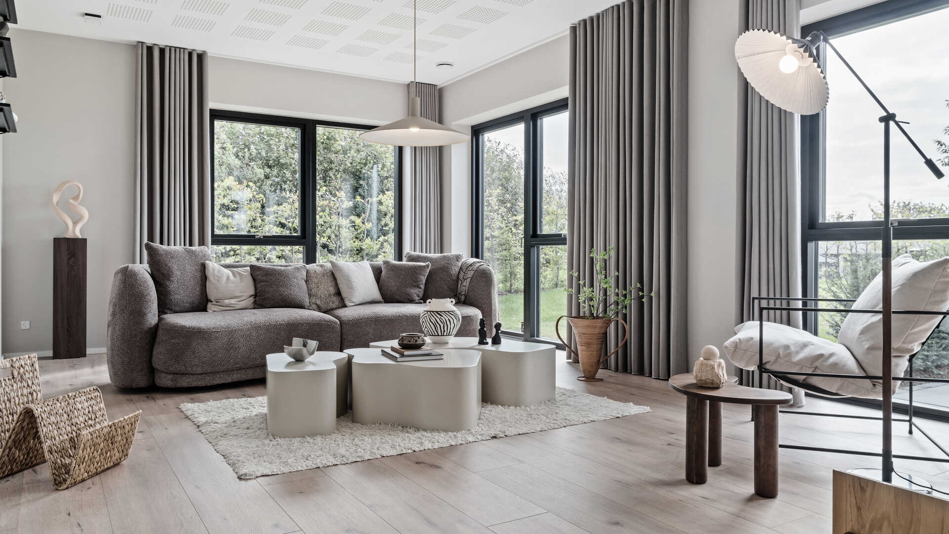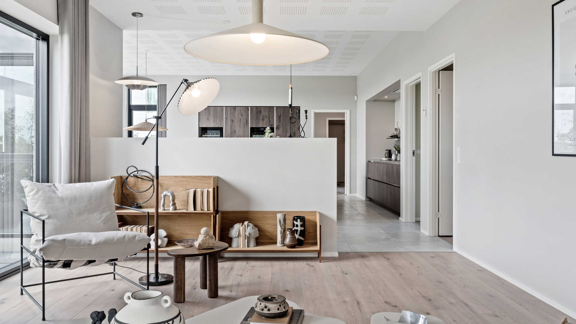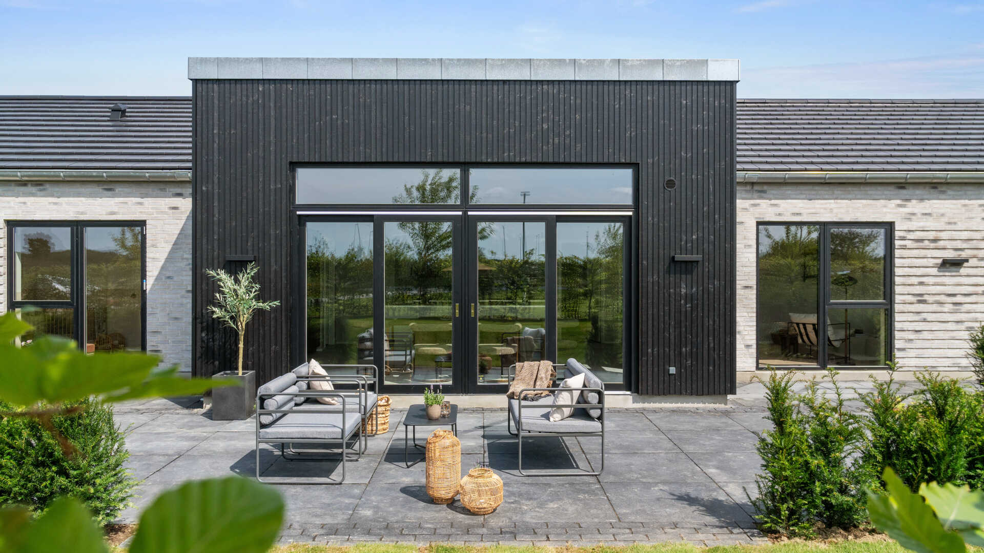 Arkitekturen er tidløs i denne moderne parcel. Læg mærke til den smukke facade, hvor både reces og trædetaljer giver længehuset masser af personlighed.