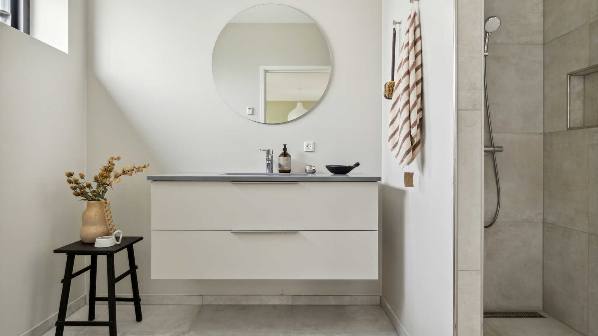 Forældreafdelingen er indrettet med masser af skabsplads i åbent walk-through og et skønt badeværelse.