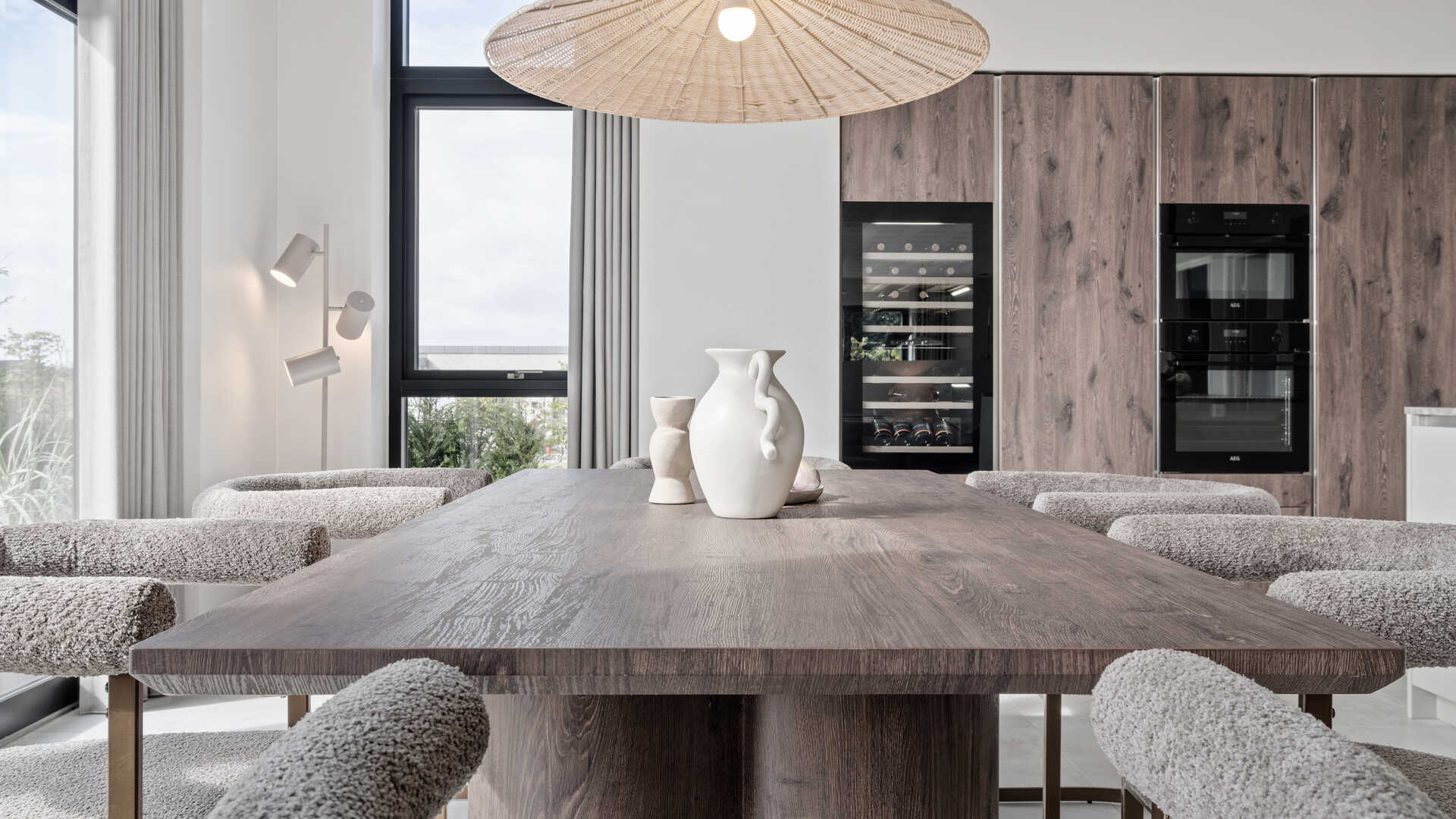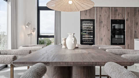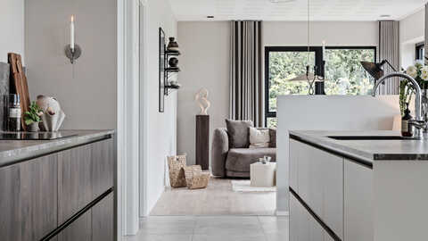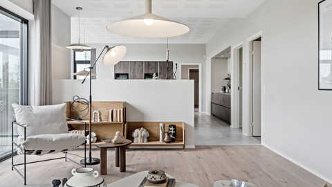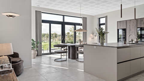 I det rummelige og regulære køkken/alrum er der et godt lysindfald fra de store vinduespartier og den store skydedør. Her er højt til loftet, masser af opbevaringsplads og god plads til både madlavning og hygge. Køkken/alrummet ligger i åben forbindelse med stuen - let delt af en halvmur.