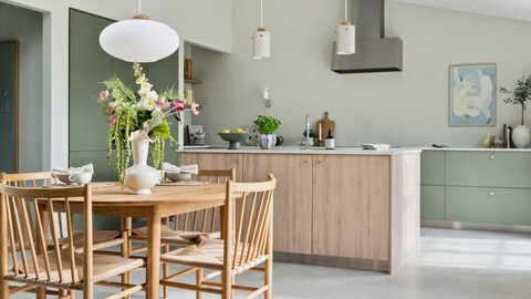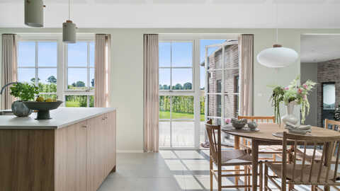 Det hyggelige køkken/alrum - husets absolutte hjerte - har fantastisk lysindfald fra de store vinduespartier og ovenlys. Her er masser af skabsplads og udgang til de skønne uderum.
