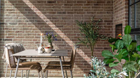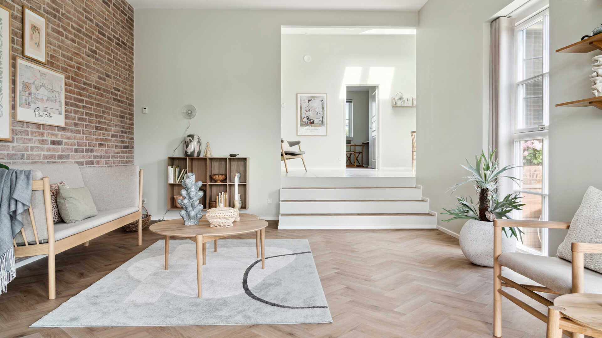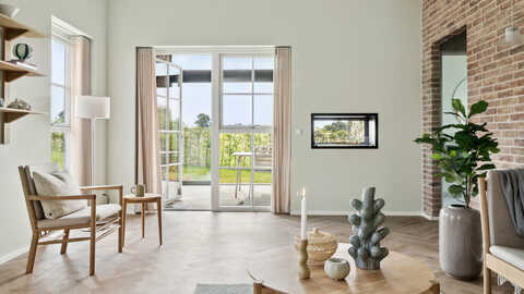 I stuen er der rustik murstensvæg, og med biopejs i ydermuren er du også sikret en hyggelig og varmere krog på den over- og glasinddækkede terrasse.