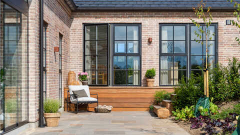 Charmerende moderne parcel med smukke sprosse vinduer og overdækket terrasse med glasinddækning.