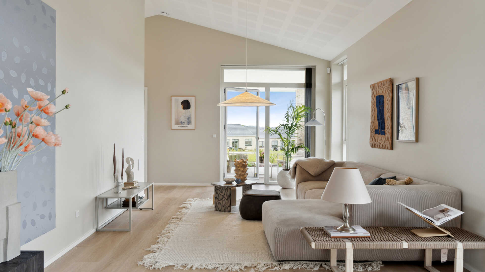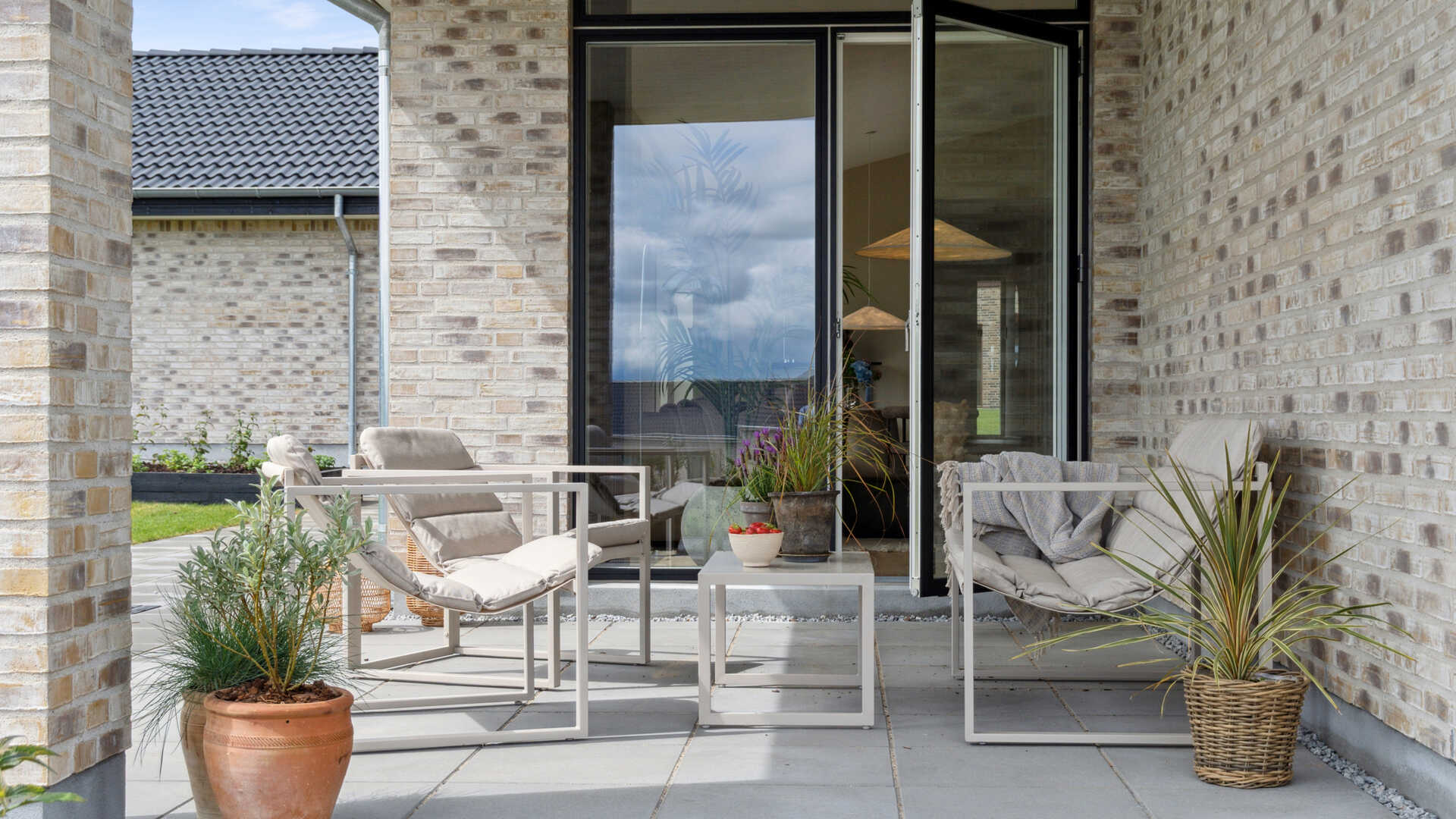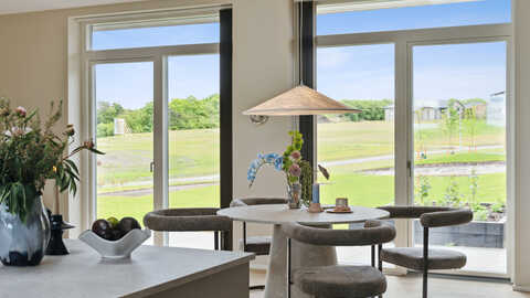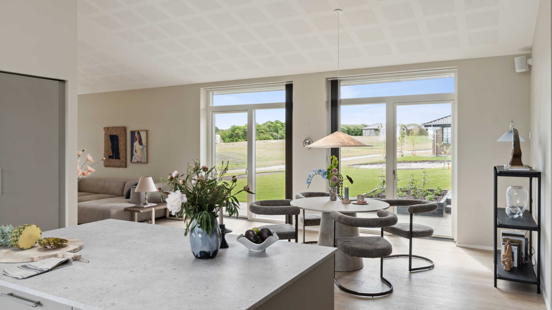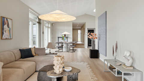 Her er husets hjerte - det store køkken/alrum og stue i ét, er husets absolutte midtpunkt med god plads til hygge og gæster. Herfra er der udgang til terrasserne på begge sider af huset og med den overdækkede terrasse forlænges de skønne sommeraftner.
