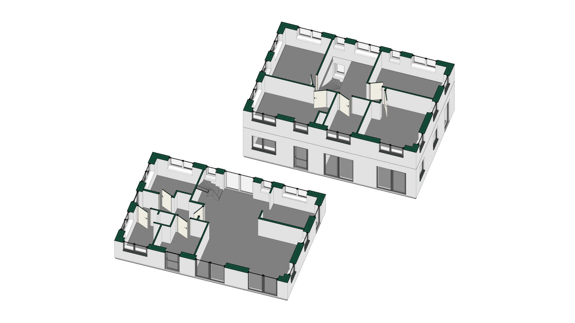 En mere lukket køkkenindretning er her tegnet sammen med en stor, åben vinkel med spisestue og stue. Det giver et enormt rum med lysindfald fra tre sider. Førstesalen byder på hele tre store børneværelser, badeværelser og stort soveværelse med skabsvæg.