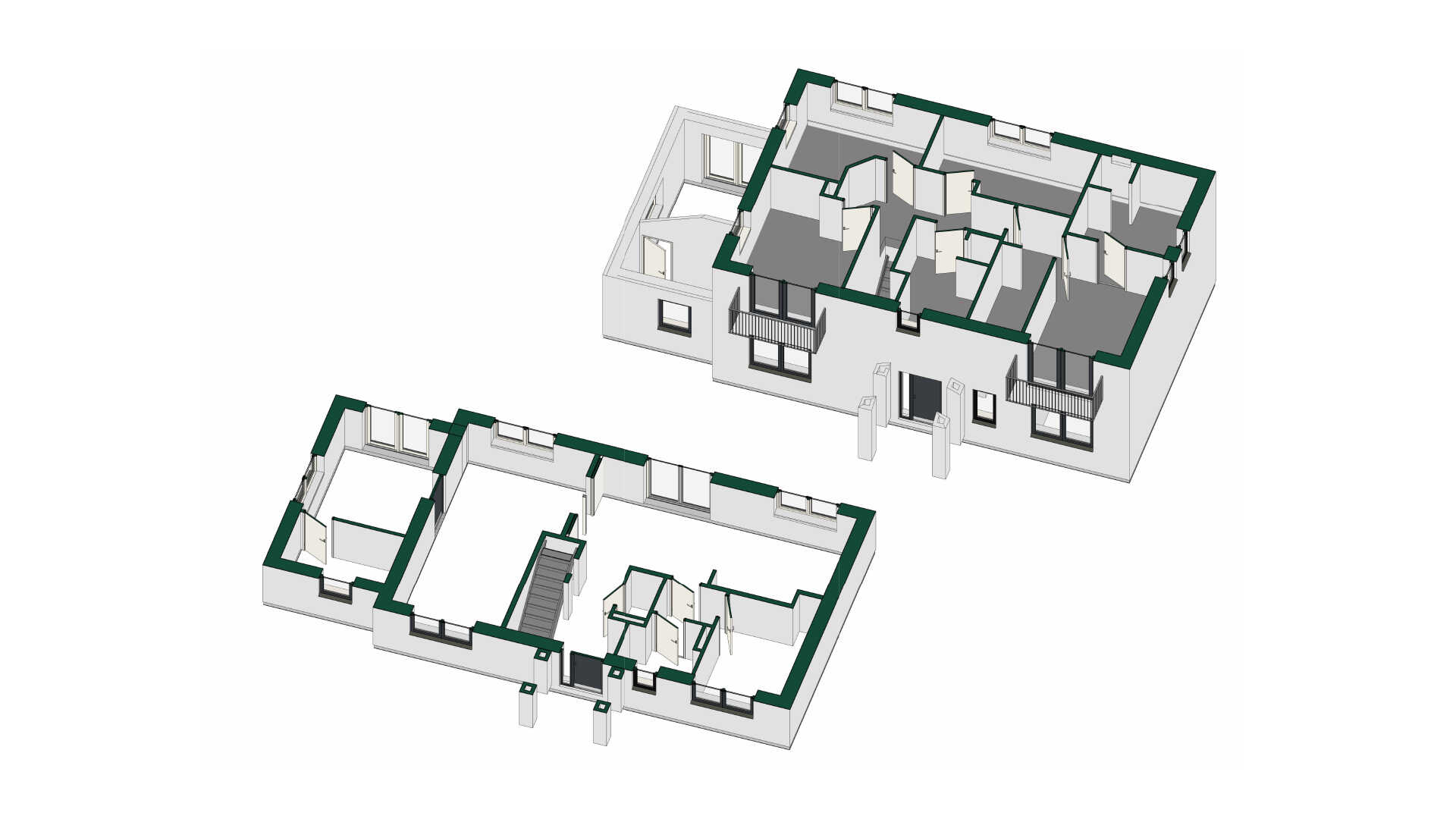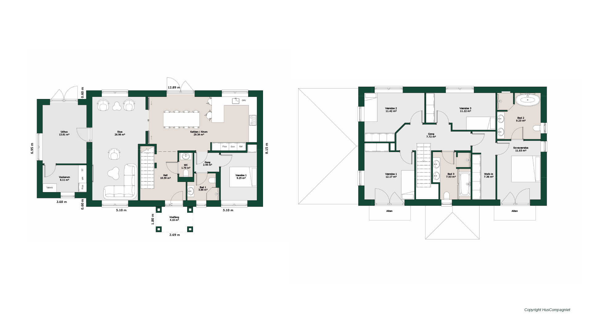 Førstesalen rummer tre store værelser med skabsvægge, soveværelse med walk-in og to store badeværelser - begge med både badekar og bruser.