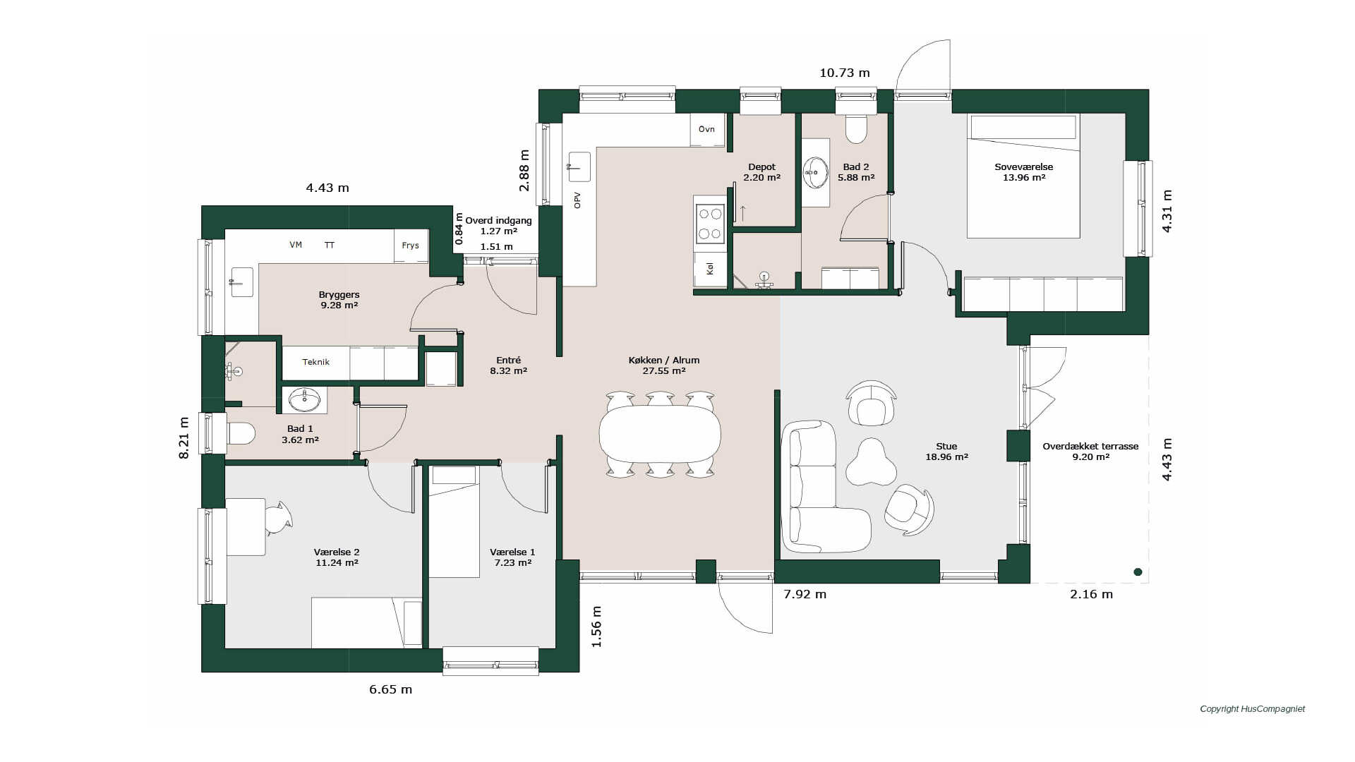 På husets 133 kompakte kvadratmeter får man dejligt gennemgående køkken/alrum med lysindfald fra to sider, praktisk depot og åben forbindelse til den hyggelige stue. Her er der et stort børneværelse og et mindre værelse, der kan fungere som kontor eller gæsteværelse. Bryggerset er stort og rummeligt og ligger i forbindelse med husets overdækkede indgang. Forældreafdelingen rummer et stort soveværelse med skabsvæg og udgang til terrasse samt badeværelse.
