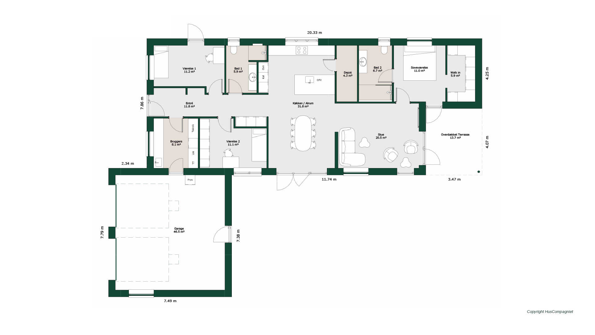 Længehus med kig gennem hele huset. To gode værelse med masser af skabsplads. Gennemgående køkken/alrum med stort depot, og dejlig vaske-ø. Åben forbindelse til stuen, hvorfra der også er adgang til den store overdækkede terrasse. Forældreafdeling med stort walk-in og badeværelse med mulighed for dobbelt bruser.