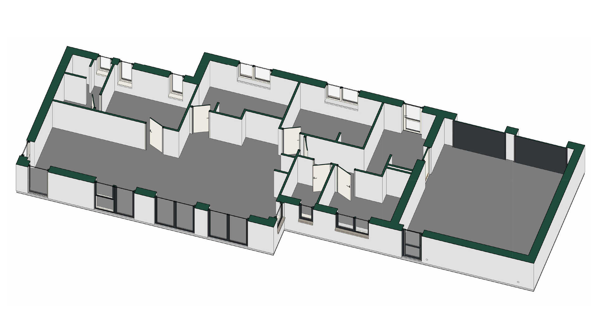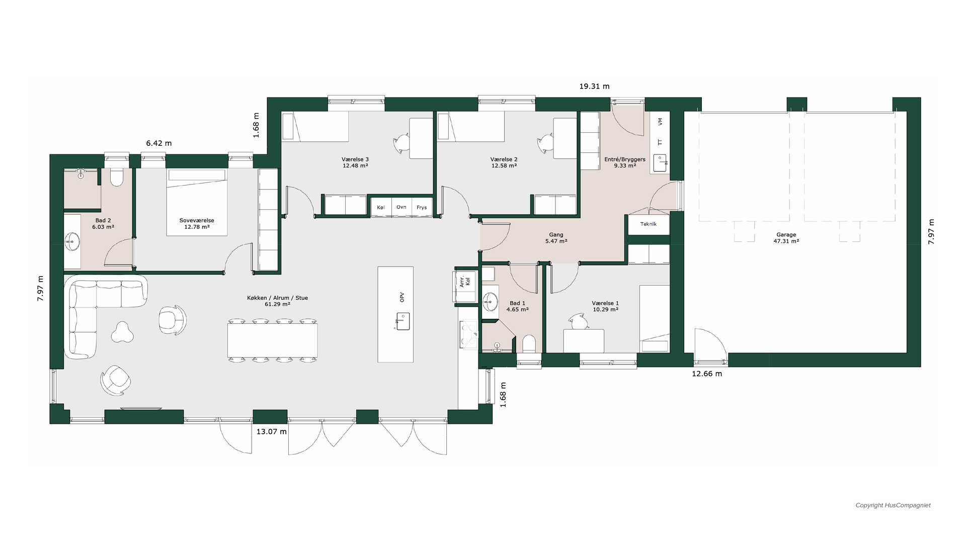 Husets to store børneværelser ligger omkring køkken/alrummet og er begge med indbyggede skabe. Det tredje værelse fungerer fint som børneværelse, men er også oplagt som kontor eller gæsteværelse.