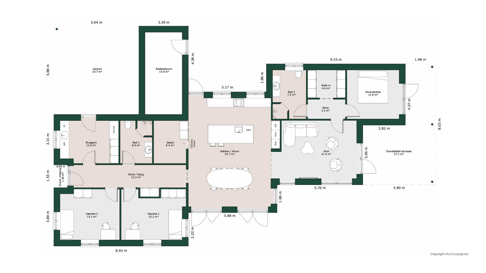 Med de to store børneværelser liggende separat i husets ene ende, er der gode forhold for både små og store børn. Køkken/rummet er husets absolutte hjerte og danner et centralt samlingspunkt i husets midte. Voksenafdelingen rummer både badeværelse, walk-in og soveværelse med udgang til den overdækkede terrasse - en lille oase til de voksne.