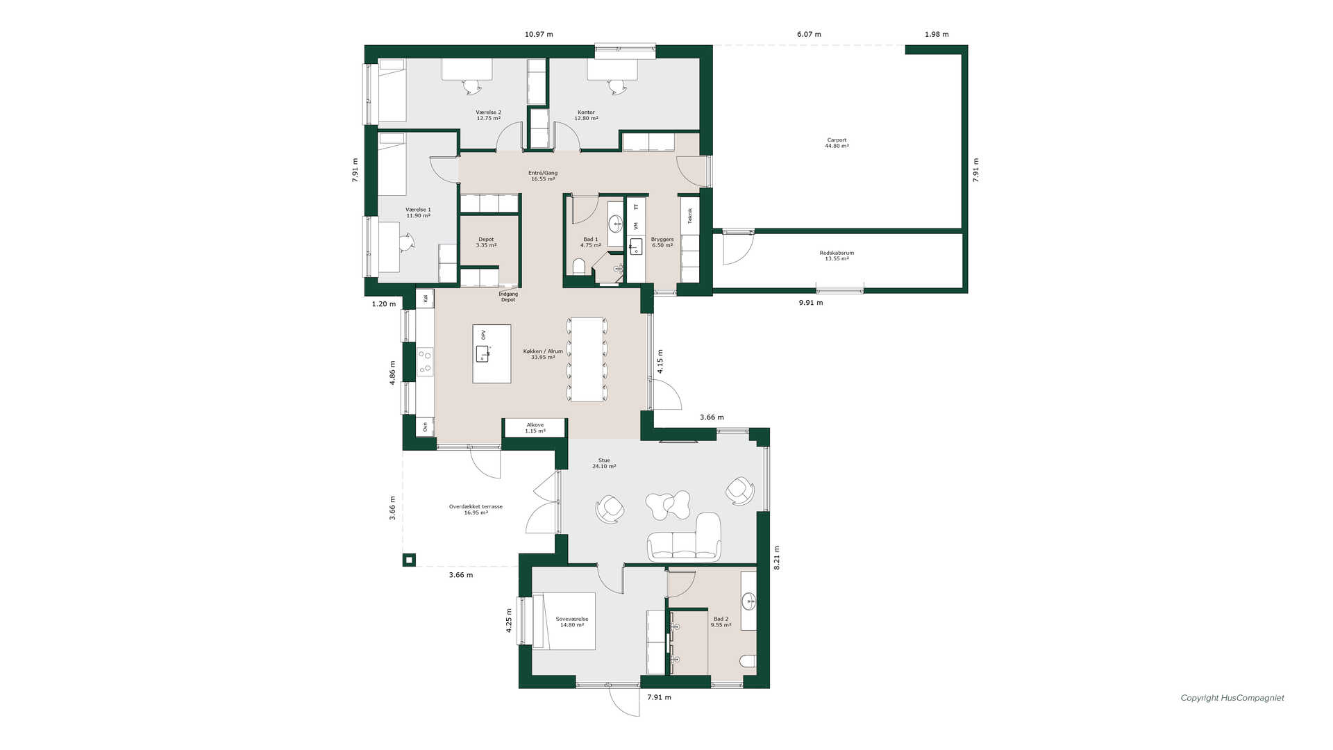 Med husets hjerte - det store køkken/alrum i midten af huest dannes en naturlig opdeling. Her kan børnene trives i de tre store værelser med adgang til eget badeværelse og egen indgang når de bliver store. Køkken/alrummet rummer både hyggelig alkove, stort depotrum og ikke mindst udgang til overdækket terrasse. Forældreafdelingen rummer et stort soveværelse med udgang til terrasse og stort badeværelse med dorbbelt brus. Via carporten kommer man tørskoet indenfor og har nem adgang til husets bryggers.