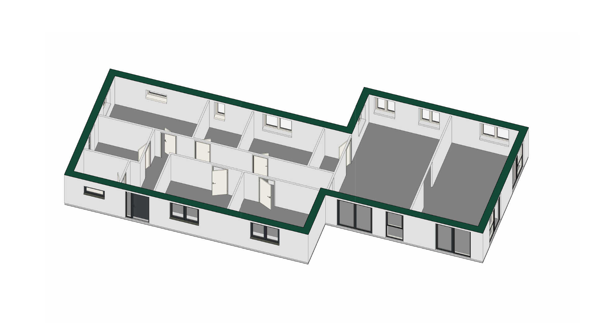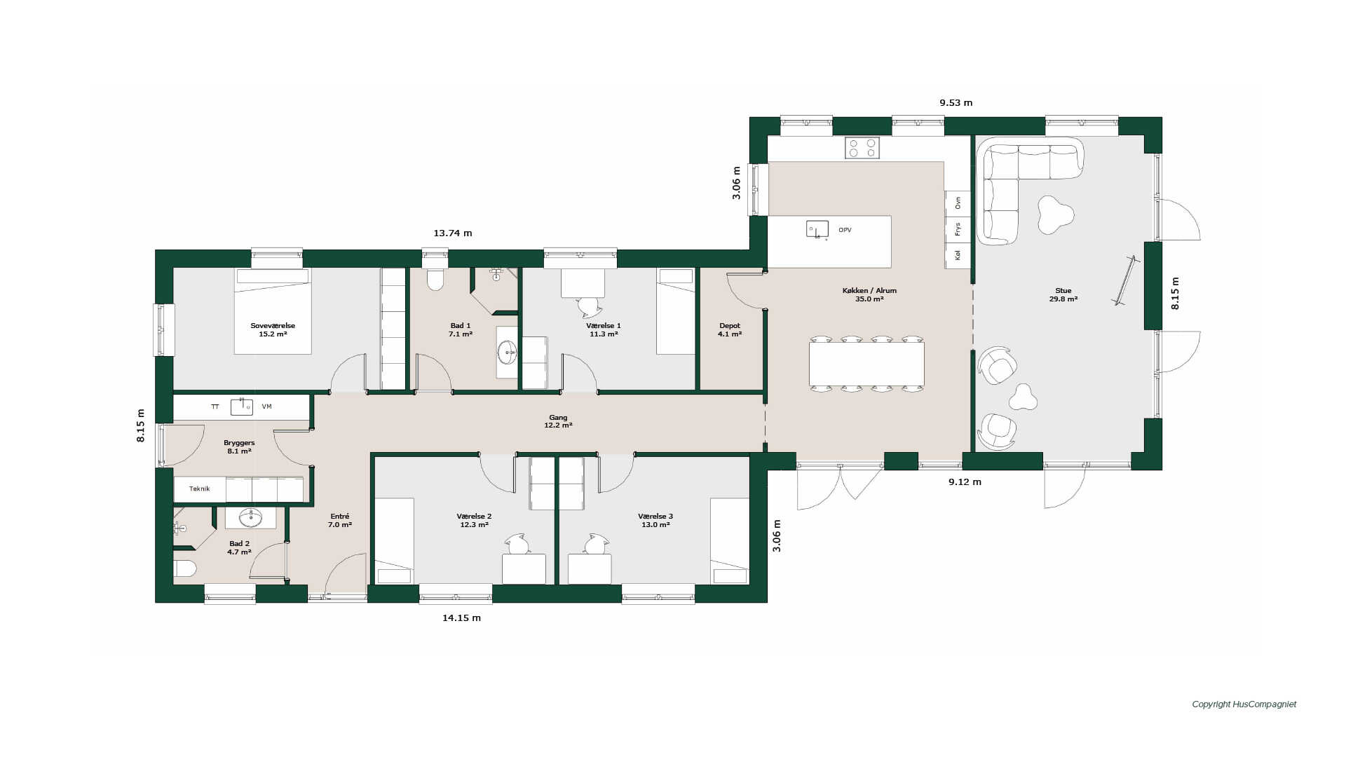 En anderledes planløsning hvor alle husets værelser ligger samlet - her er 3 store børneværelser, stort soveværelse med skabsvæg og 2 badeværelser. Husets leverum er placeret i den ene ende af huset og her er masser af plads, flere udgange til terrasser og et dejligt praktisk depot.