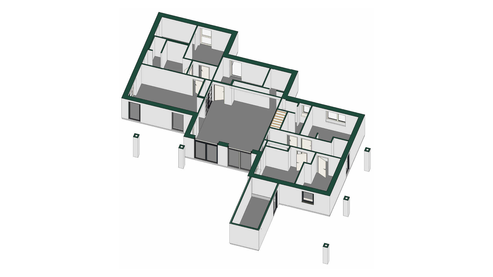 Omdrejningspunktet i denne planløsning er det store køkken/alrum, der ligger i åben forbindelse med stuen. Her er plads til hygge og samvær både ved spisebordet og i alkoven. Med lækre detaljer som både vinrum og stort skjult depot får man et leverum der både er praktisk og lækkert. Børneafdelingen rummer to store børneværelser, badeværelse og her finder man også husets indgang samt bryggers.