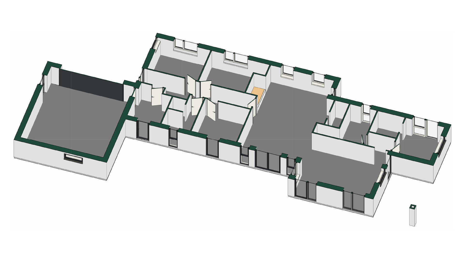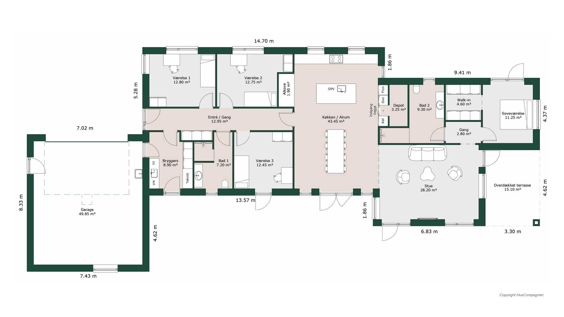 Med denne planløsning får man en separat børne/teenageafdeling med tre store værelser og badeværelse.