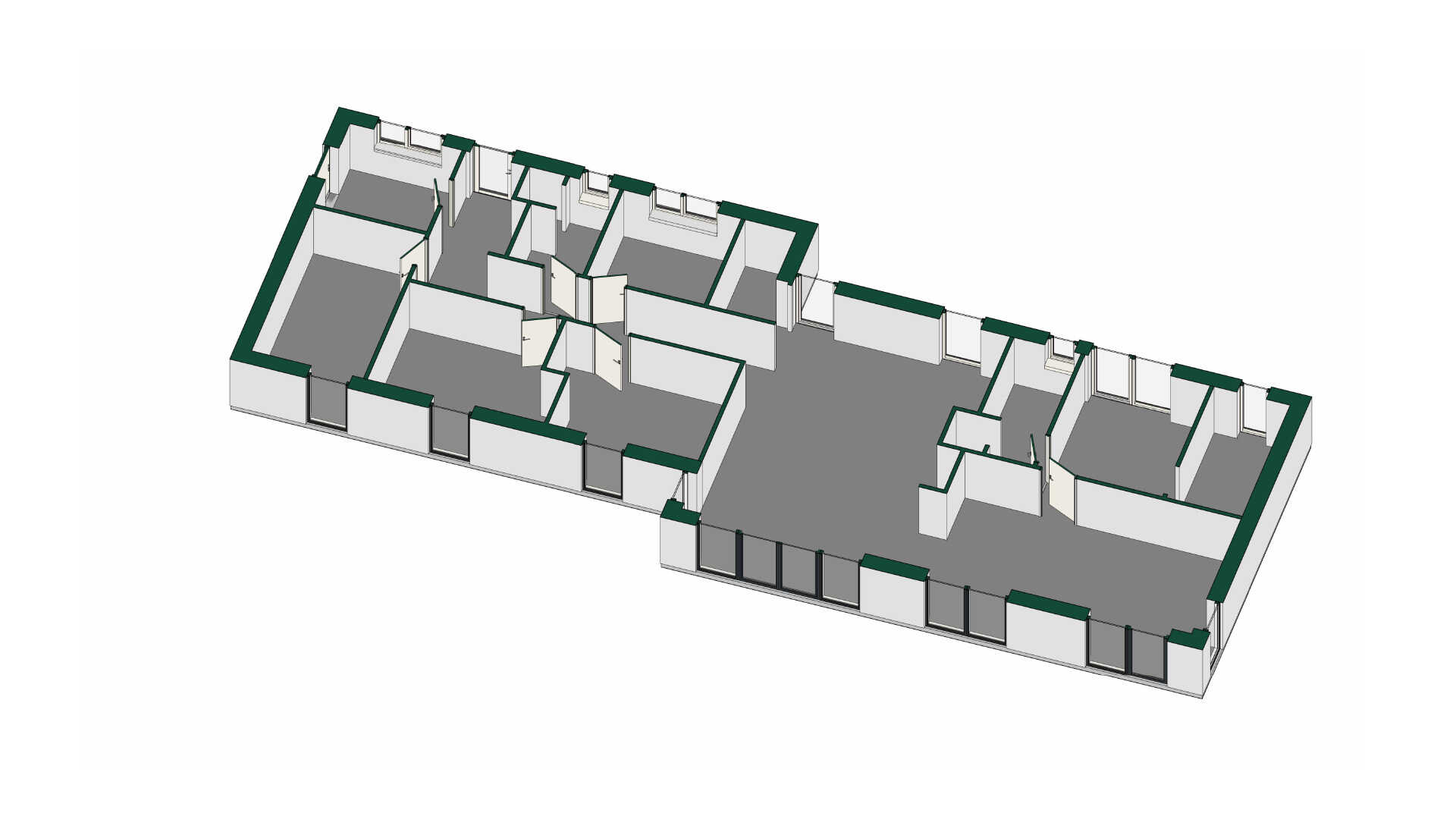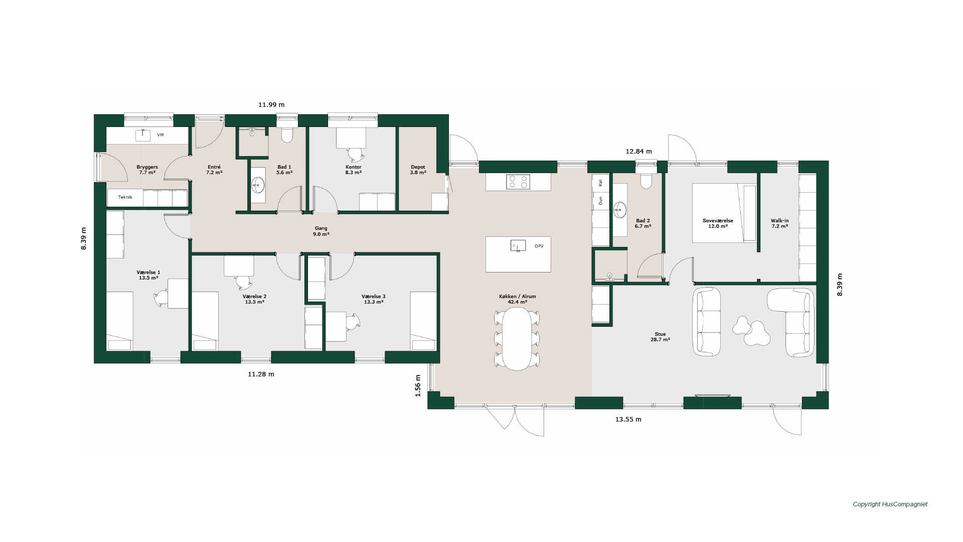En rummelig planløsning hvor den separate børneafdeling byder på tre store børneværelser, et mindre kontor og badeværelse. I forældreafdelingen er stort badeværelse, walk-in og dejligt soveværelse.