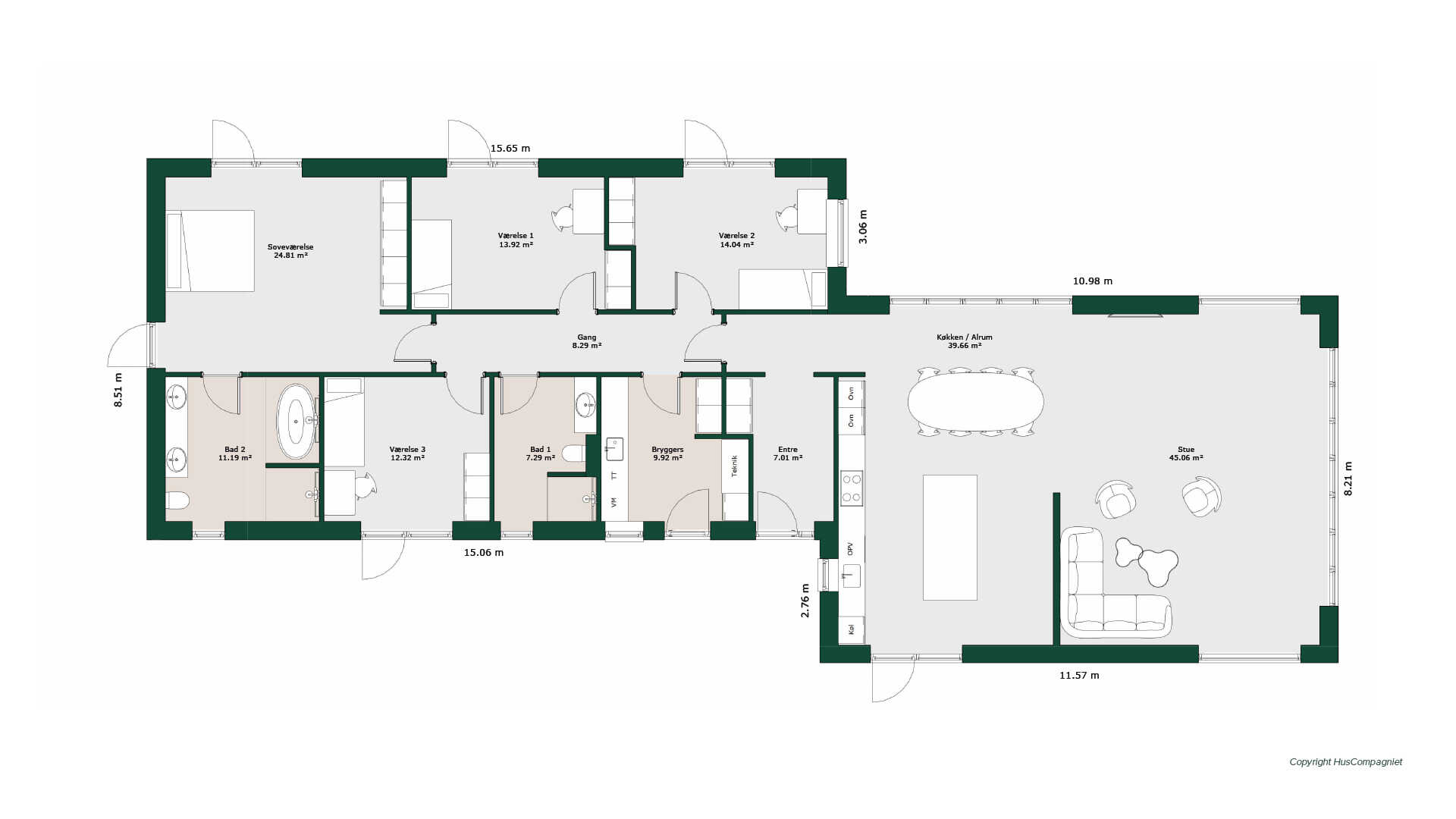Her er plads til at samle hele familien. 45 m2 stue, med åben forbindelse til det store gennemgående køkken/alrum med dejlig stort vinduesparti, som giver rigeligt med lys. Tre store børneværelser og eget bad. Stort soveværelse med stort badeværelse med plads til badekar.