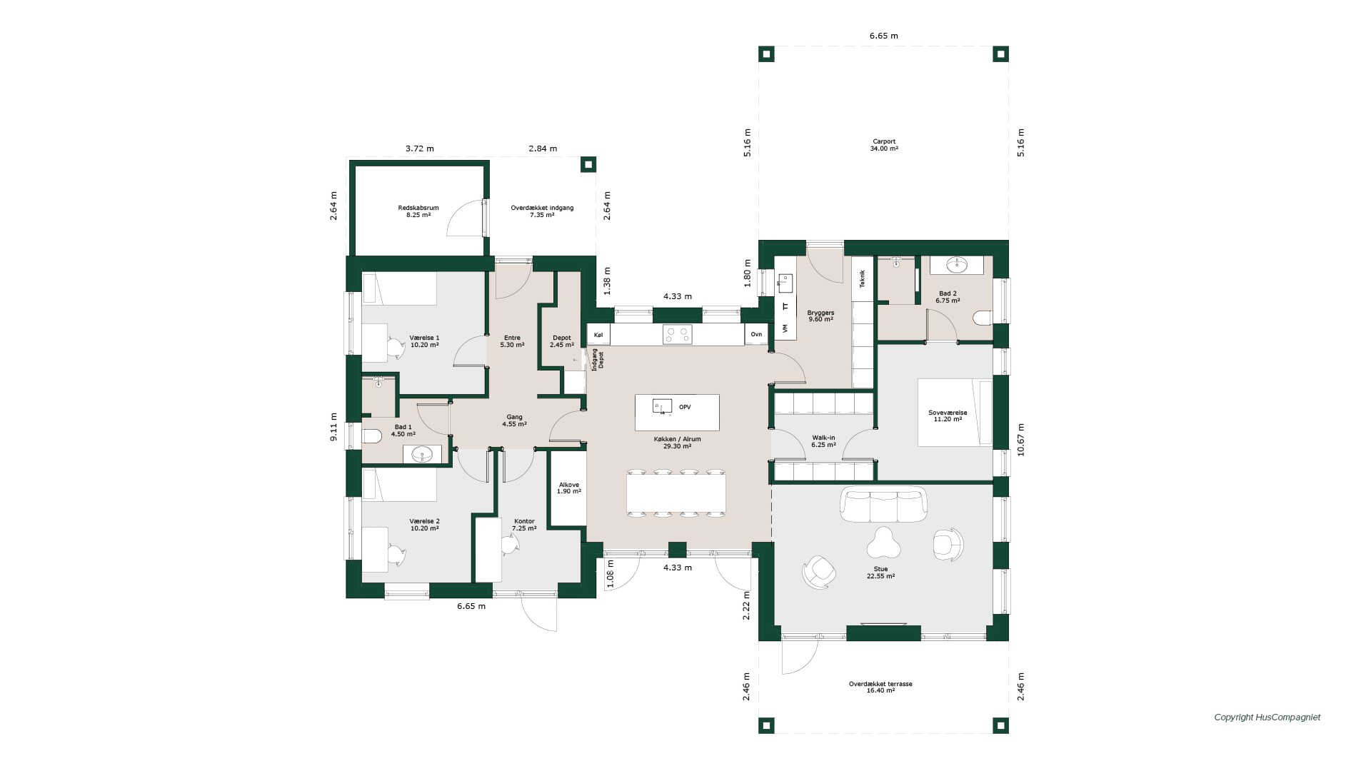 Her byder husets hjerte - det store køkken/alrum på hyggelig alkove og praktisk depot. Her er to gode børneværelser, mindre kontor og masser af opbevaring i både bryggers og de indbyggede skabsvægge. Forældreafdelingen har masser af plads med stort walk-in og eget bad. Husets H-form og terrassedørene i køkken/alrummet skaber mulighed for at skabe gode uderum med gode lækroge.