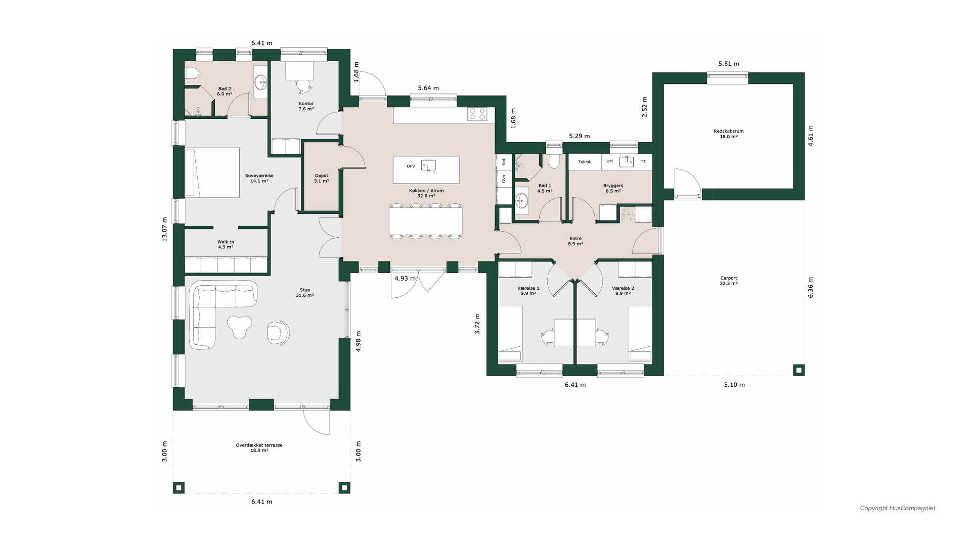 Husets store forældreafdeling rummer både stort soveværelse, walk-in og badeværelse. Husets absolutte hjerte - det store køkken/alrum har udgang til terrasse og stort depot. Stuen har udgang til husets overdækkende terrasse, så her er der rig mulighed for at skabe gode uderum med læ.