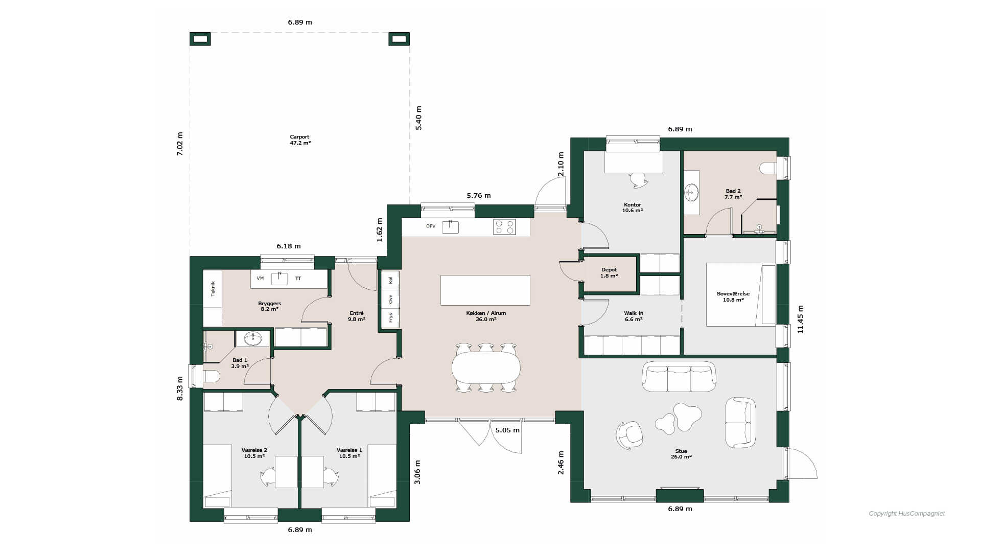 Velfungerende hus med god opdeling af rummene. Gennemgående køkken/alrum som det centrale punkt med forbindelse til børneafdeling, stue og voksenafdeling. Her får man en god indretning hvor kvadratmeterne er godt udnyttet.