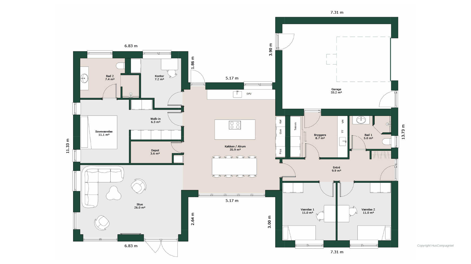 Her bydes på et H-hus med gode børneværelser, lyst og indbydende entre/gang parti. Ekstra værelse ved voksenafdelingen til familien som arbejder hjemmefra eller blot ønsker et gæsteværelse. Gode store vinduer som giver et godt naturligt lys i huset.