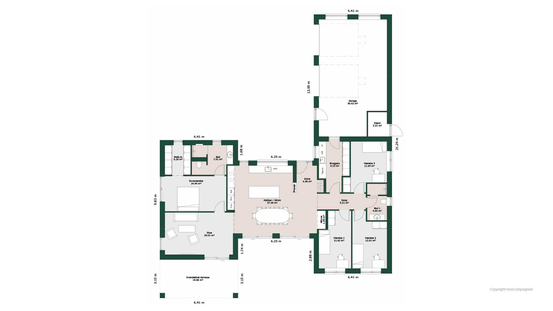 Dette fine H-hus rummer god børneafdeling med 3 gode værelser med indbyggede skabe. Fra den store garage med separat depot, er der direkte adgang til husets bryggers så det er muligt at komme tørskoet ind i huset. Det gennemgående køkken/alrum, er husets hjerte med store vinduespartier som giver masser af lys. I den rummelige entré mødes man med hygge i form af en biopejs, der også kan nydes fra køkkenet. I køkkenet finder man også en god alkove. Køkkenet leder videre til voksenafdeling med soveværelse, walk-in og badeværelse. Den hyggelige stue har udgang til god overdækket terrasse som giver mulighed for at sidde ude på lange lune sommeraftner.